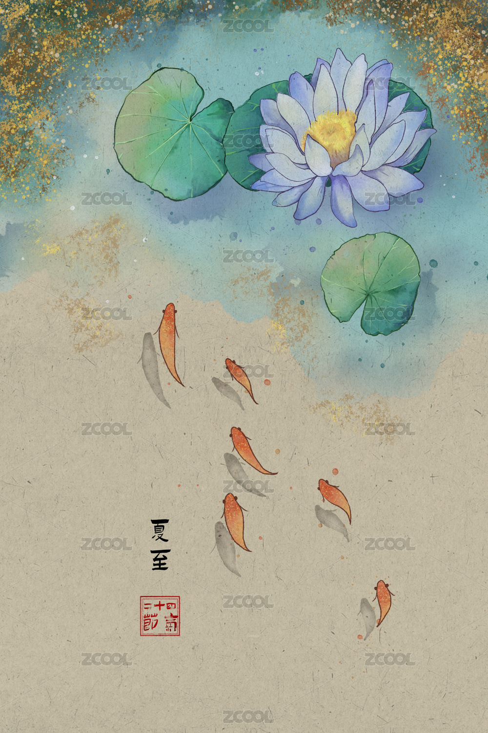 二十四節(jié)氣之夏至荷塘游魚水彩畫