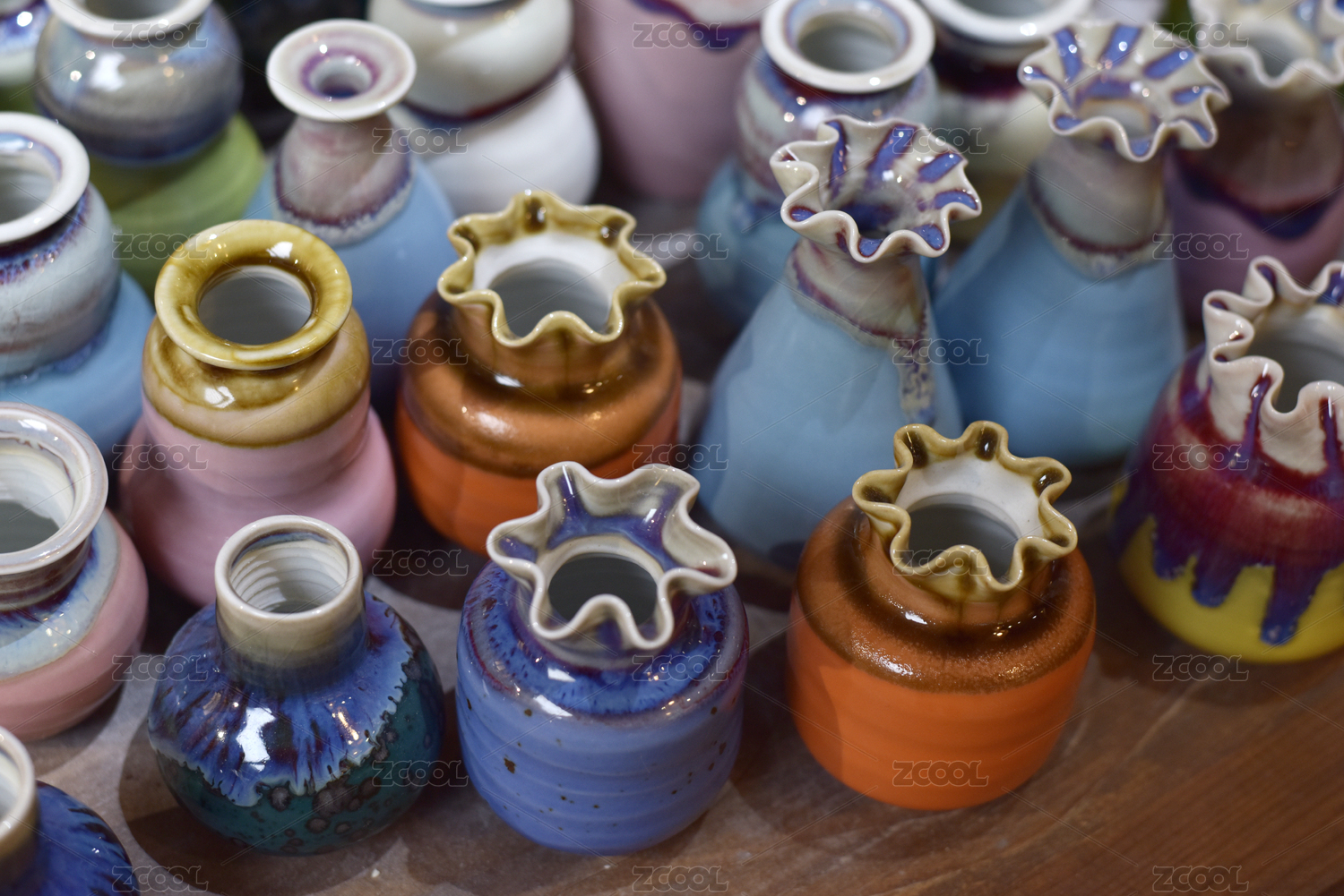 暖色背景前放在木制桌面上的白色瓷瓶與棉手套