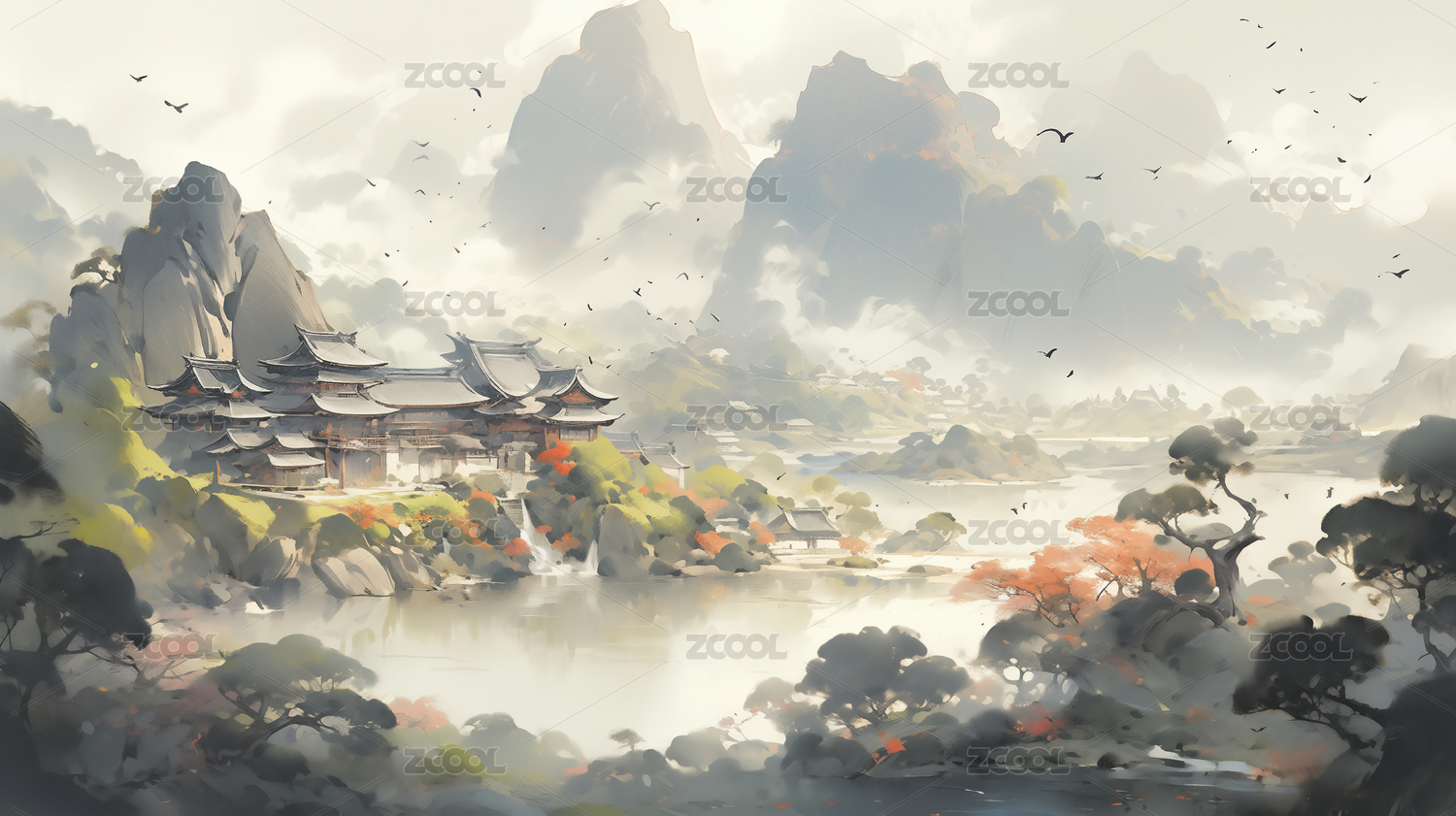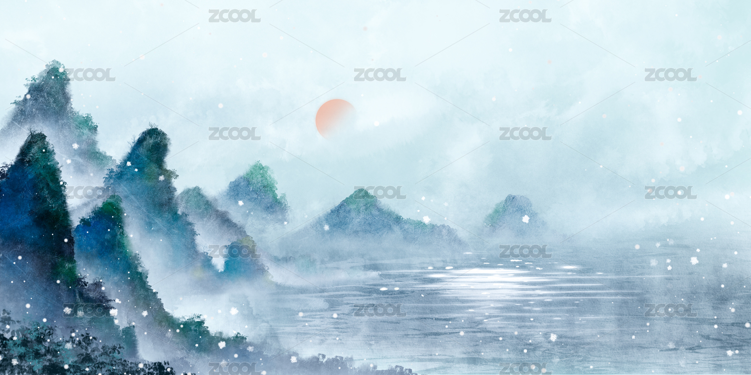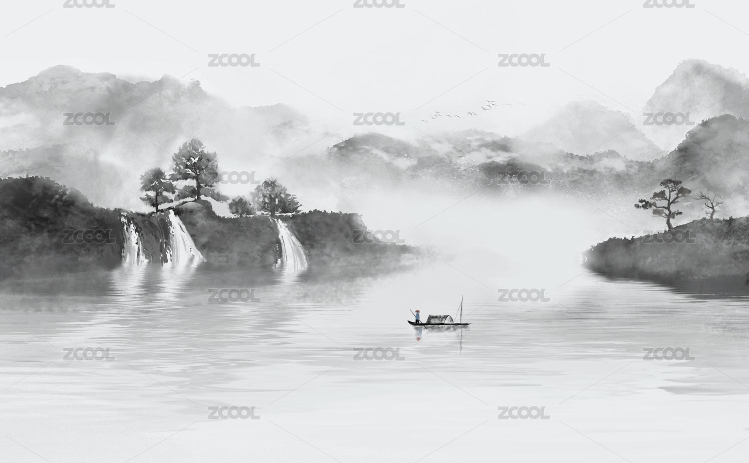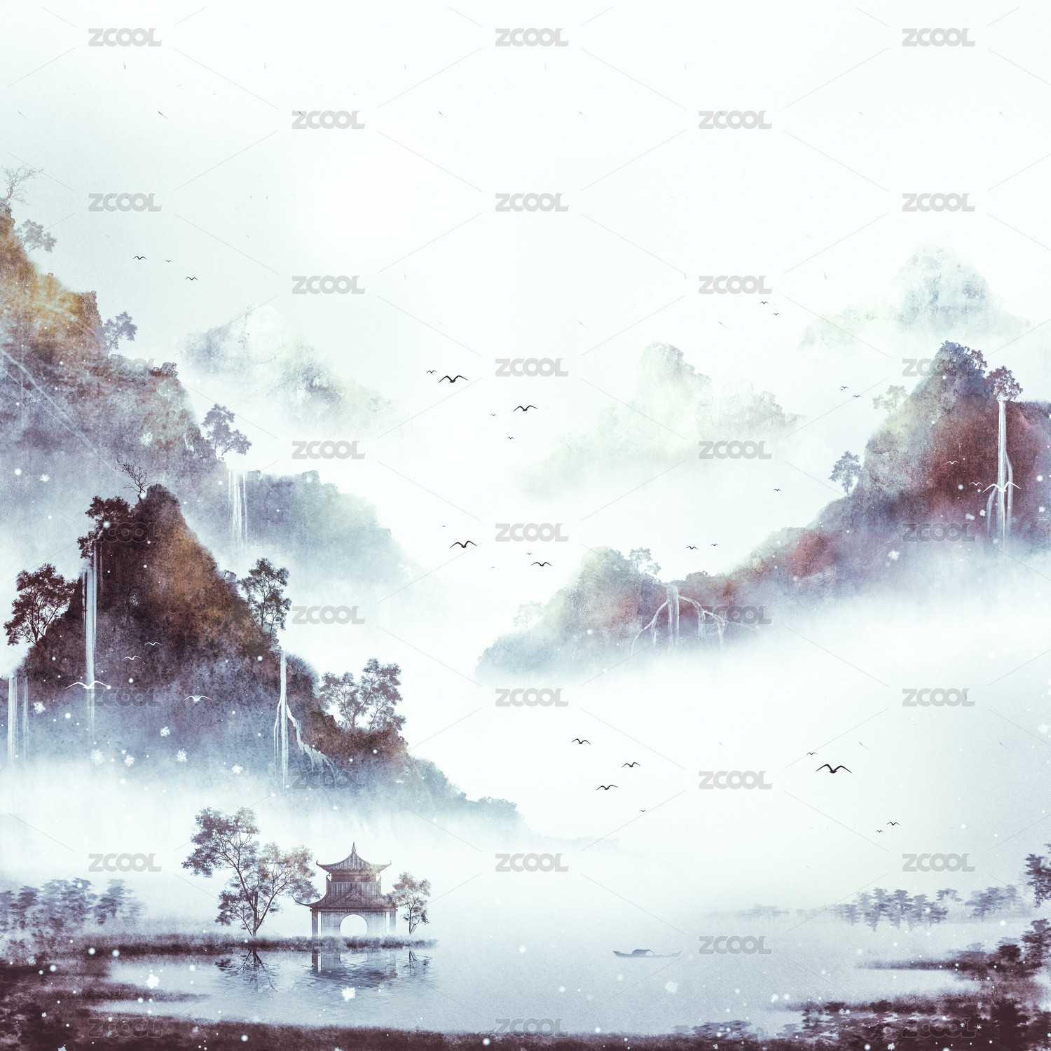 手繪中國(guó)風(fēng)水墨意境山水風(fēng)景
