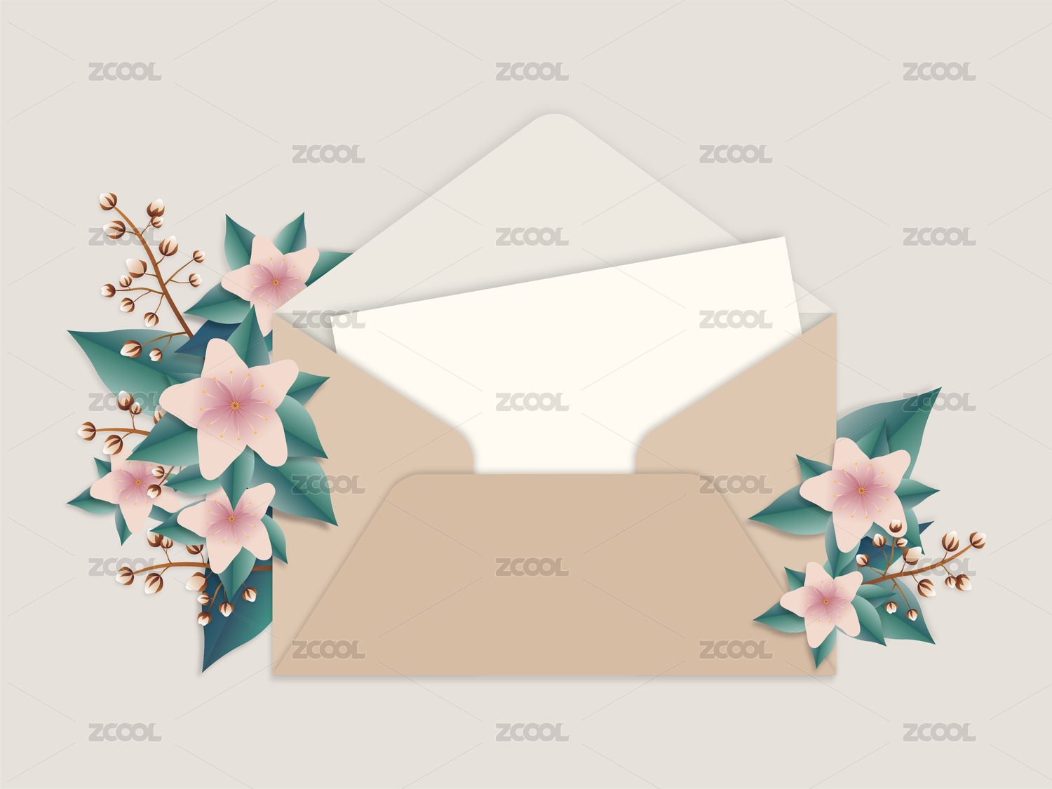 被鮮花圍繞的空白的信封信件書信