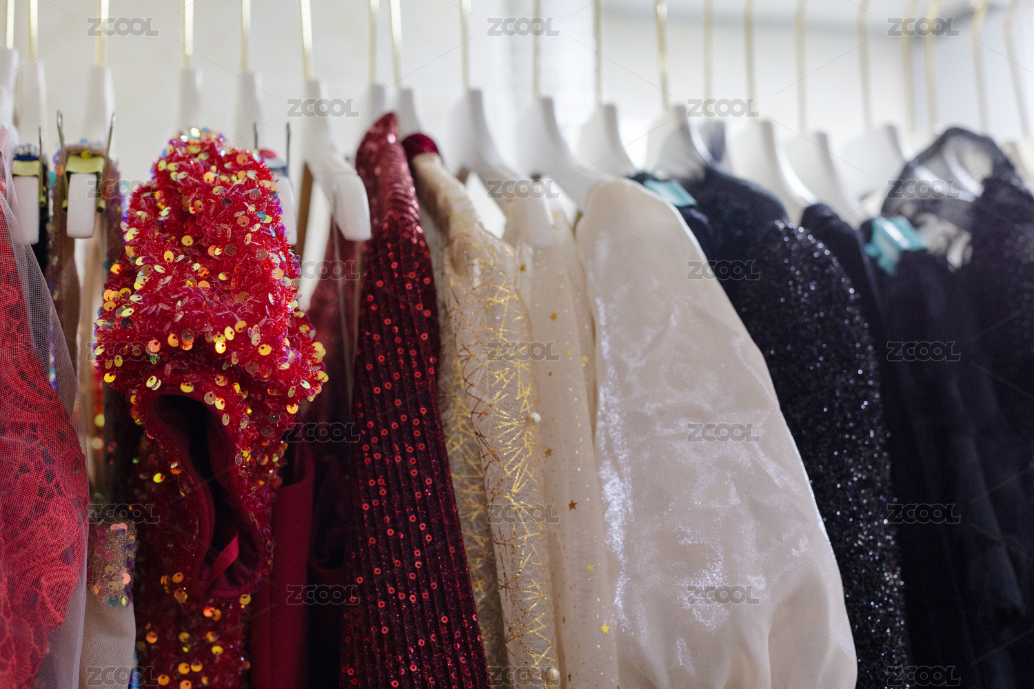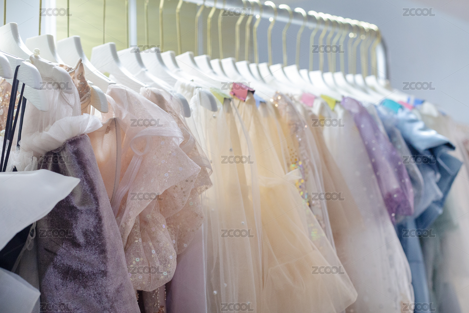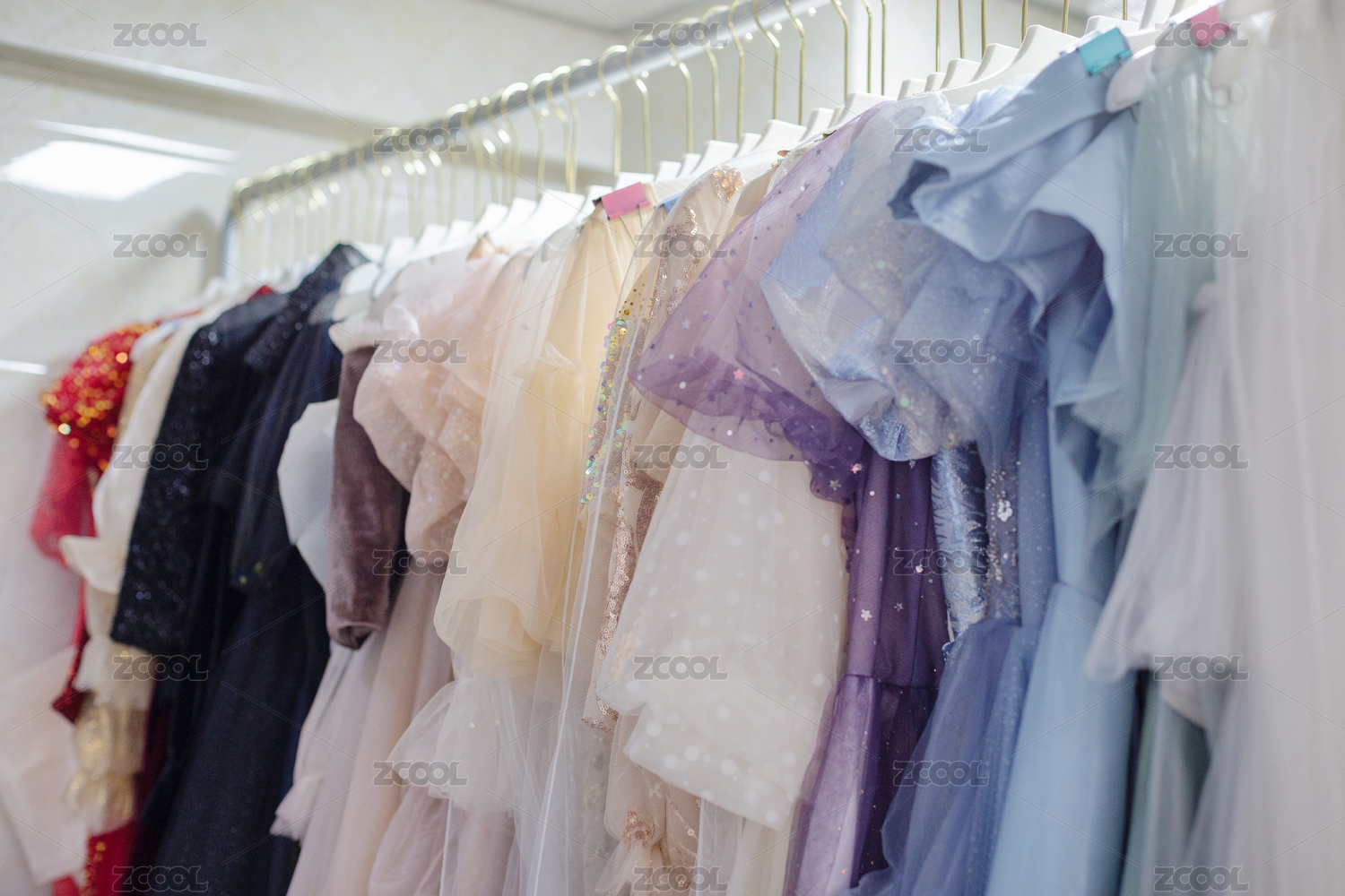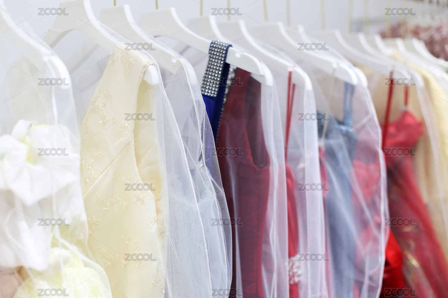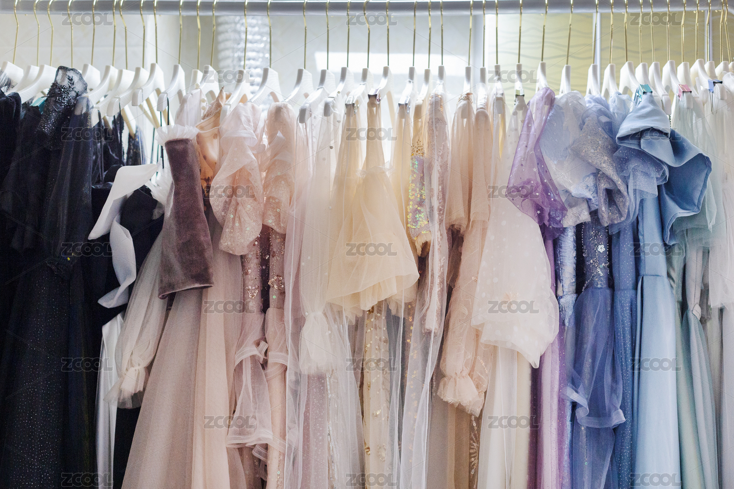 衣架上掛著的一排不同色彩的女式禮服