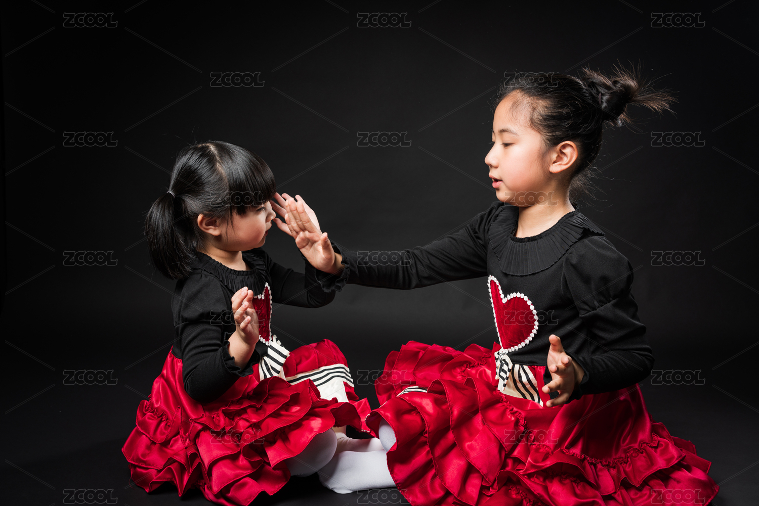 兩個(gè)穿禮服在黑色背景前玩耍的女孩
