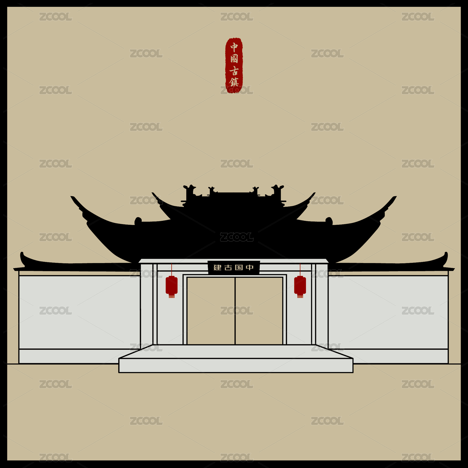 線描北京四合院門口