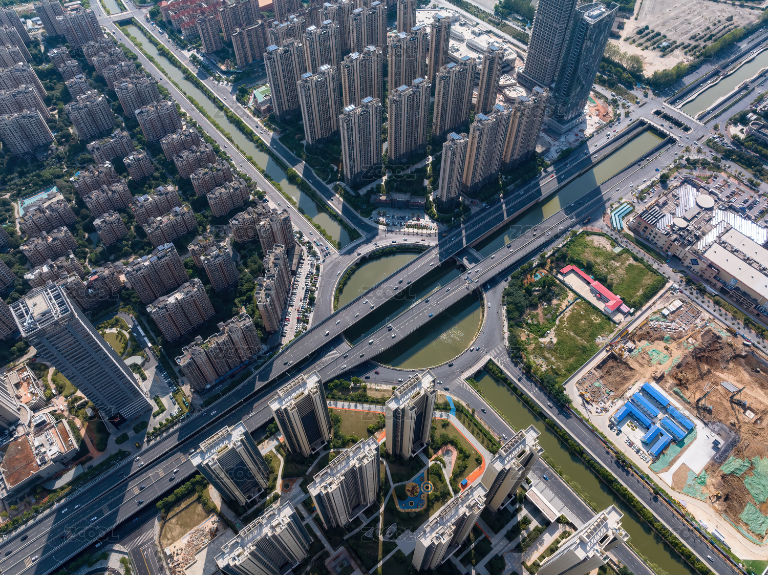 江西南昌鳥(niǎo)瞰城市高速公路與高樓交匯航拍