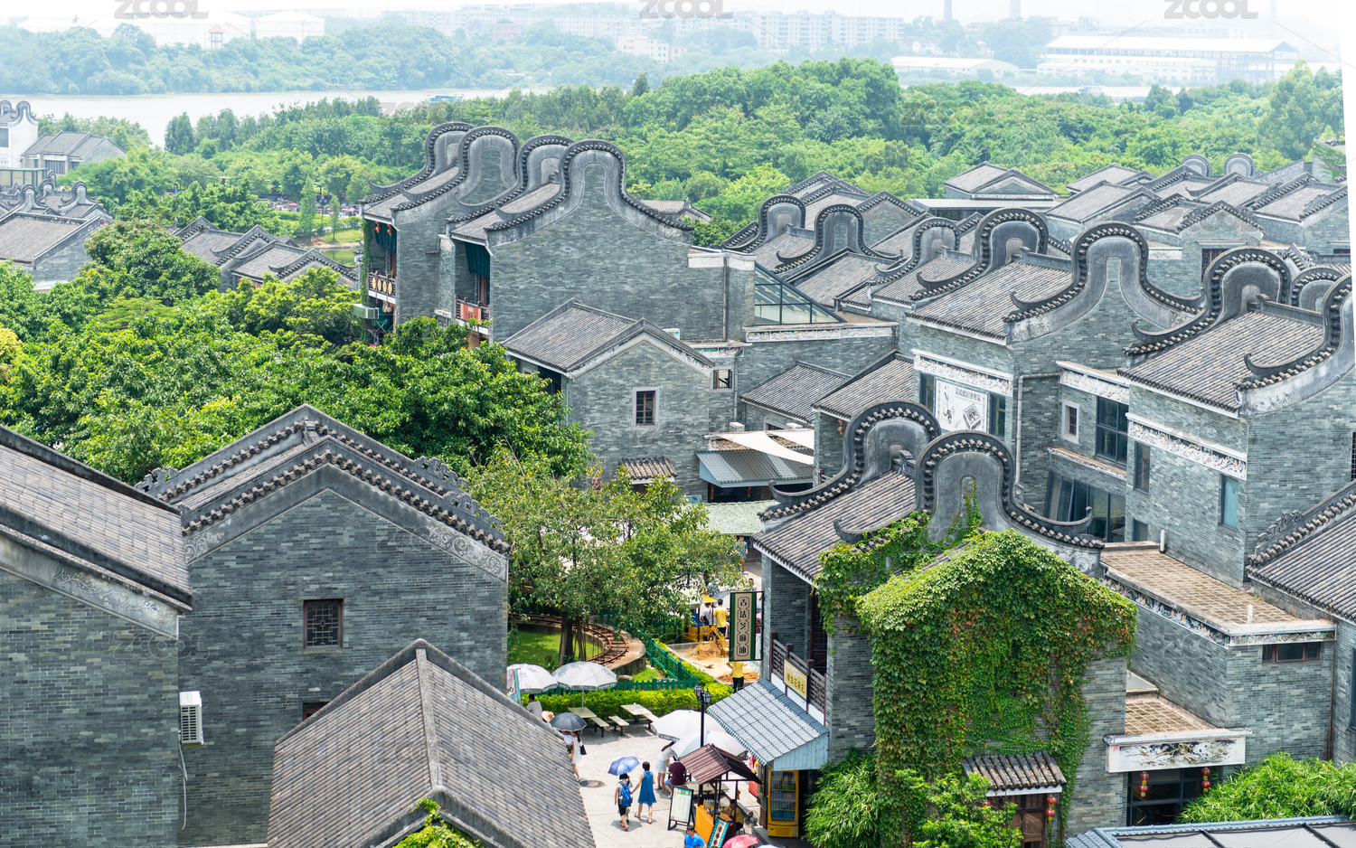 鳥(niǎo)瞰廣州嶺南印象園建筑群古村落。