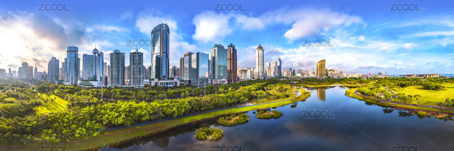 Panorama View of Urban Landscape. Binhai CBD and Evergreen Park Area of Haikou City, Hainan province, China