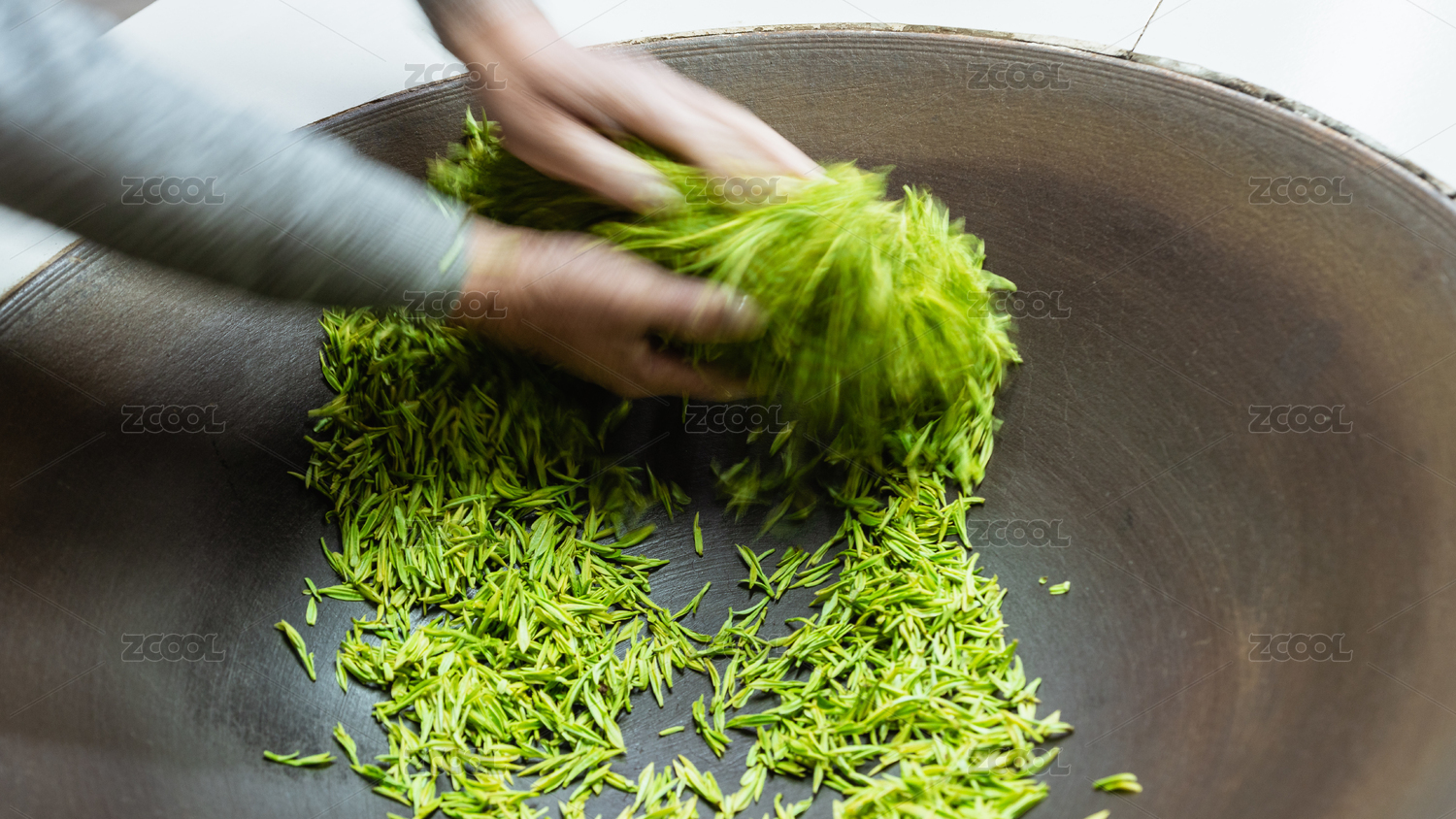 工人在炒鍋中人工炒制綠茶的過(guò)程