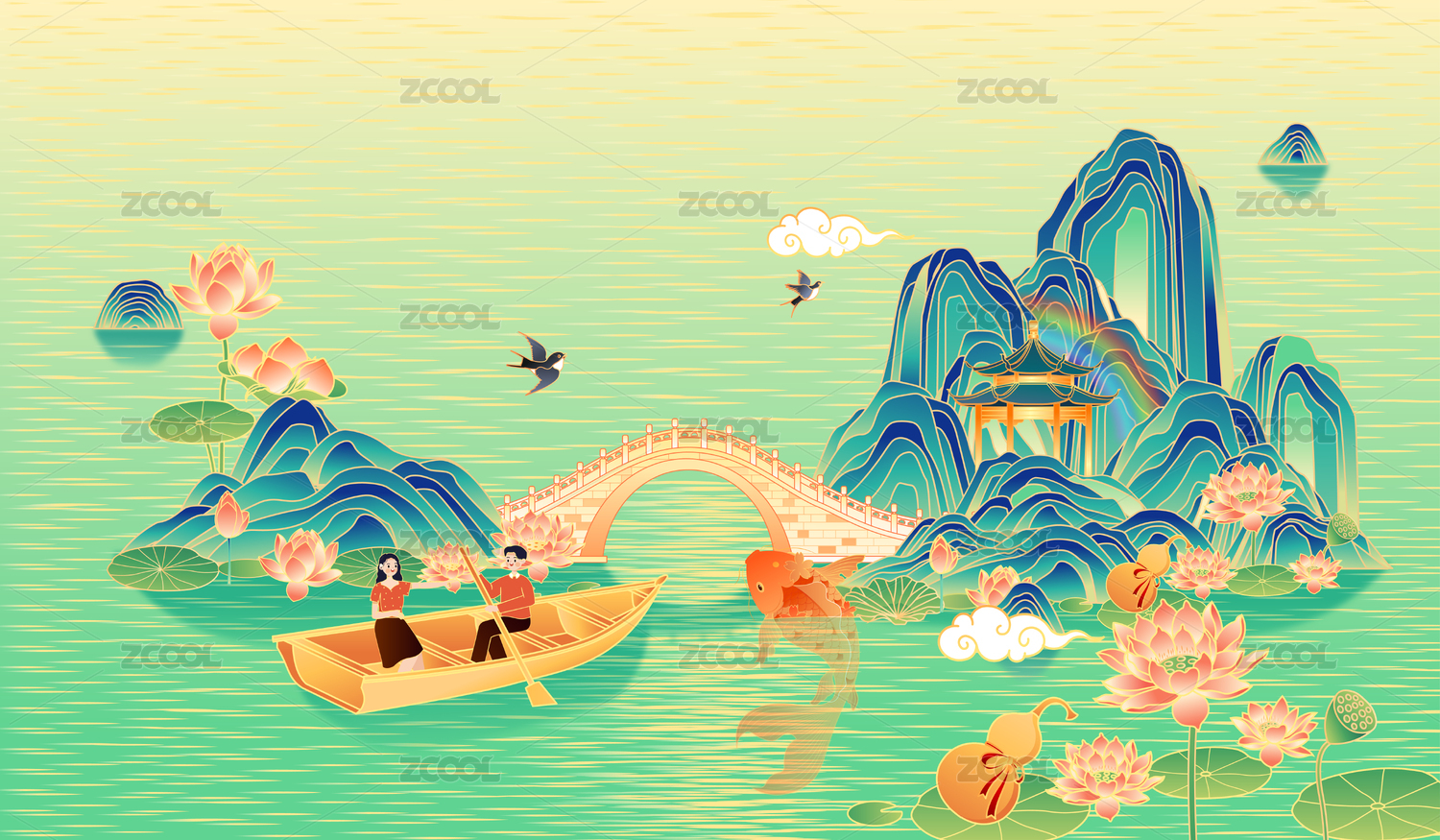 新中式國(guó)潮風(fēng)格山水風(fēng)景插畫(huà)