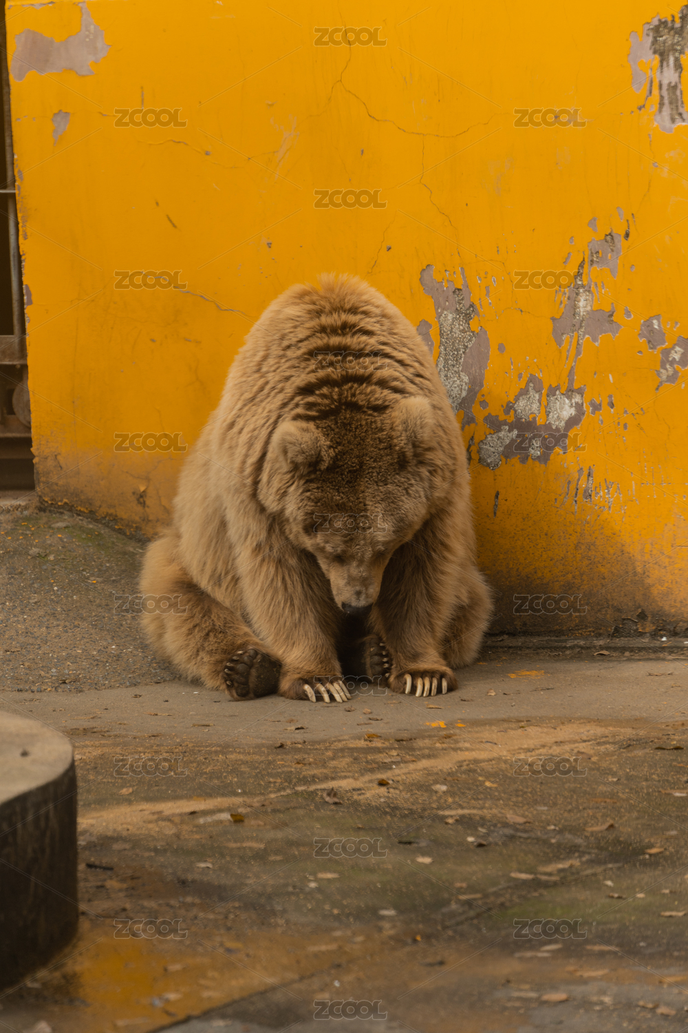 一只棕熊靠著黃色墻壁打盹