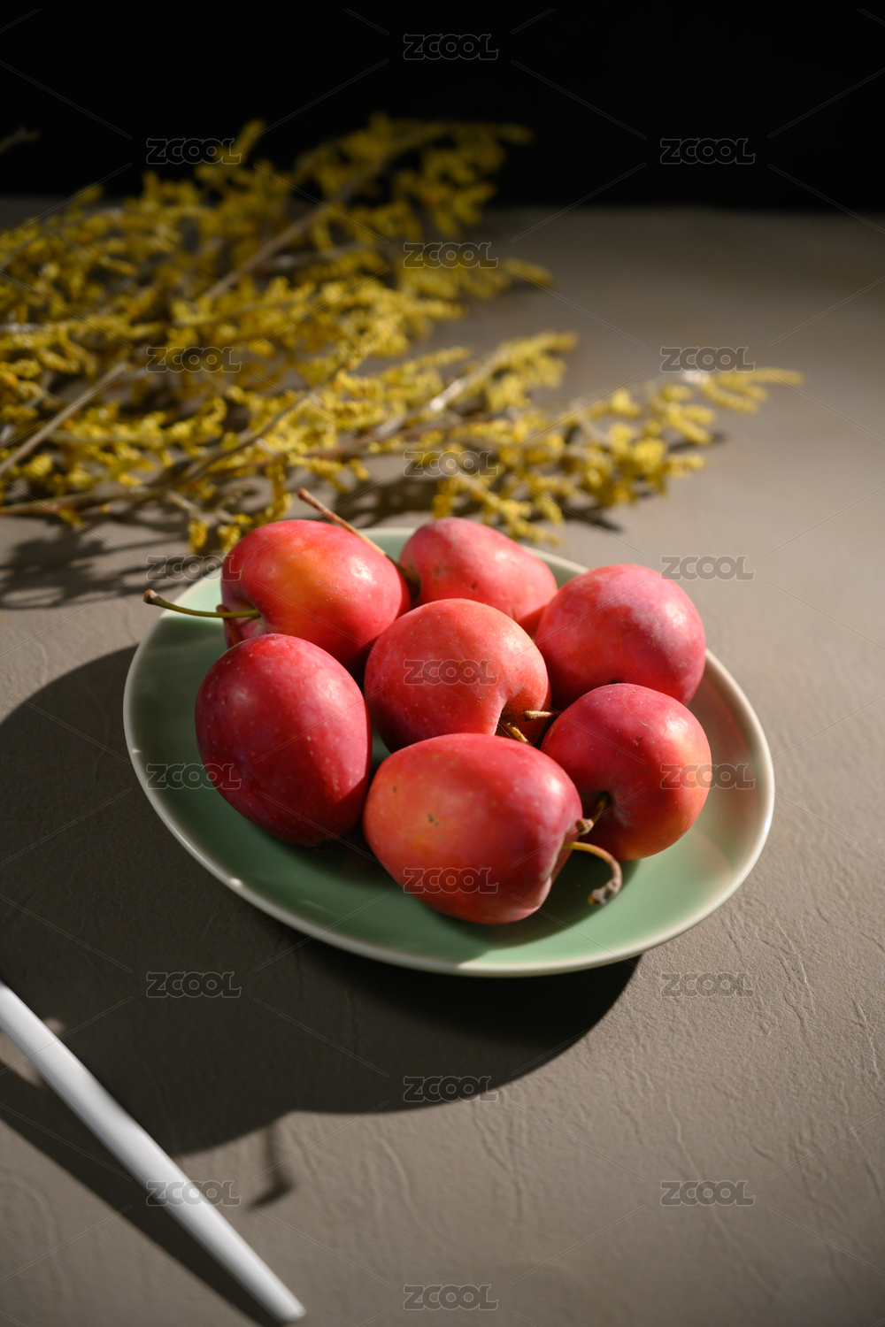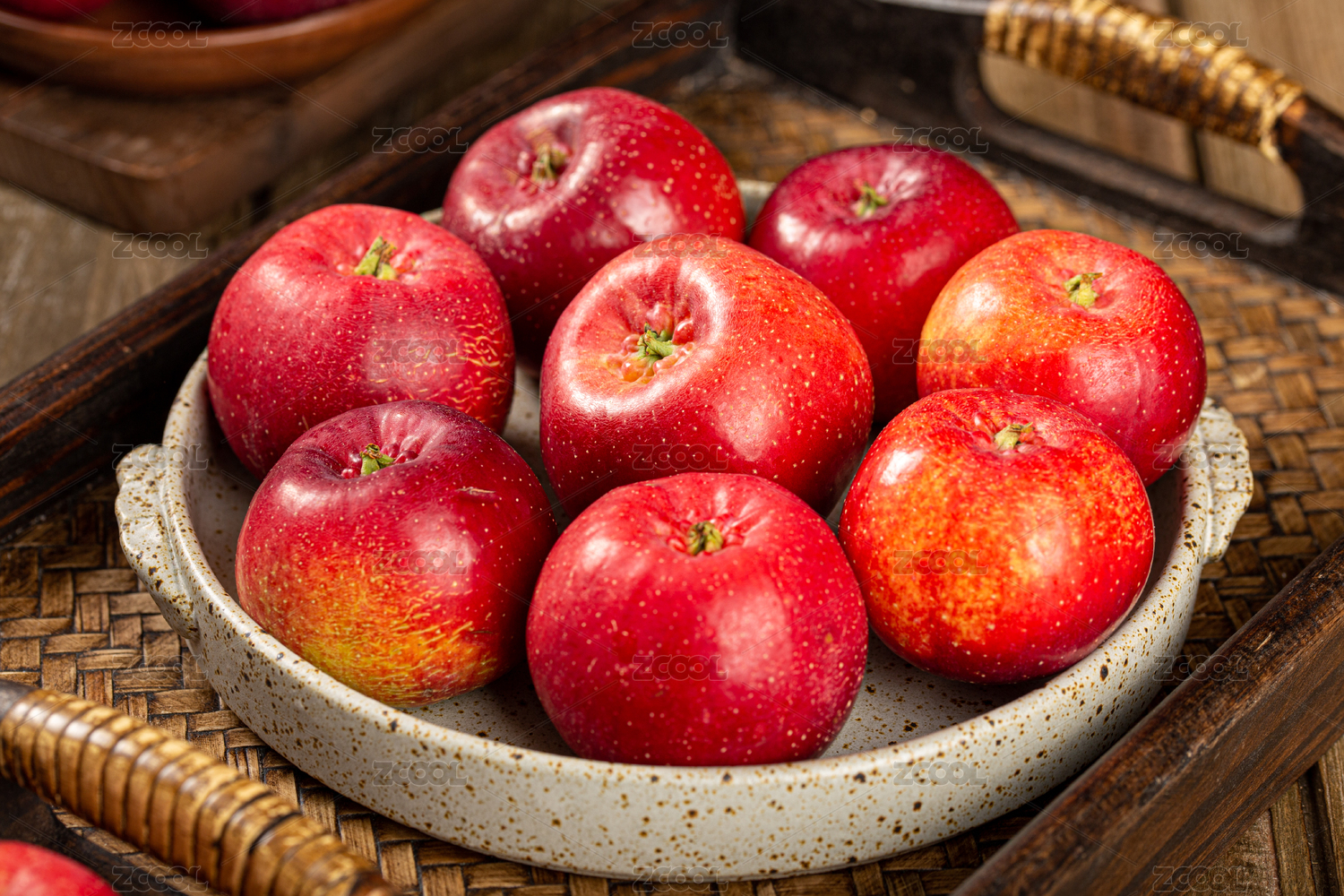 桌面上的盤子里的新鮮海棠果