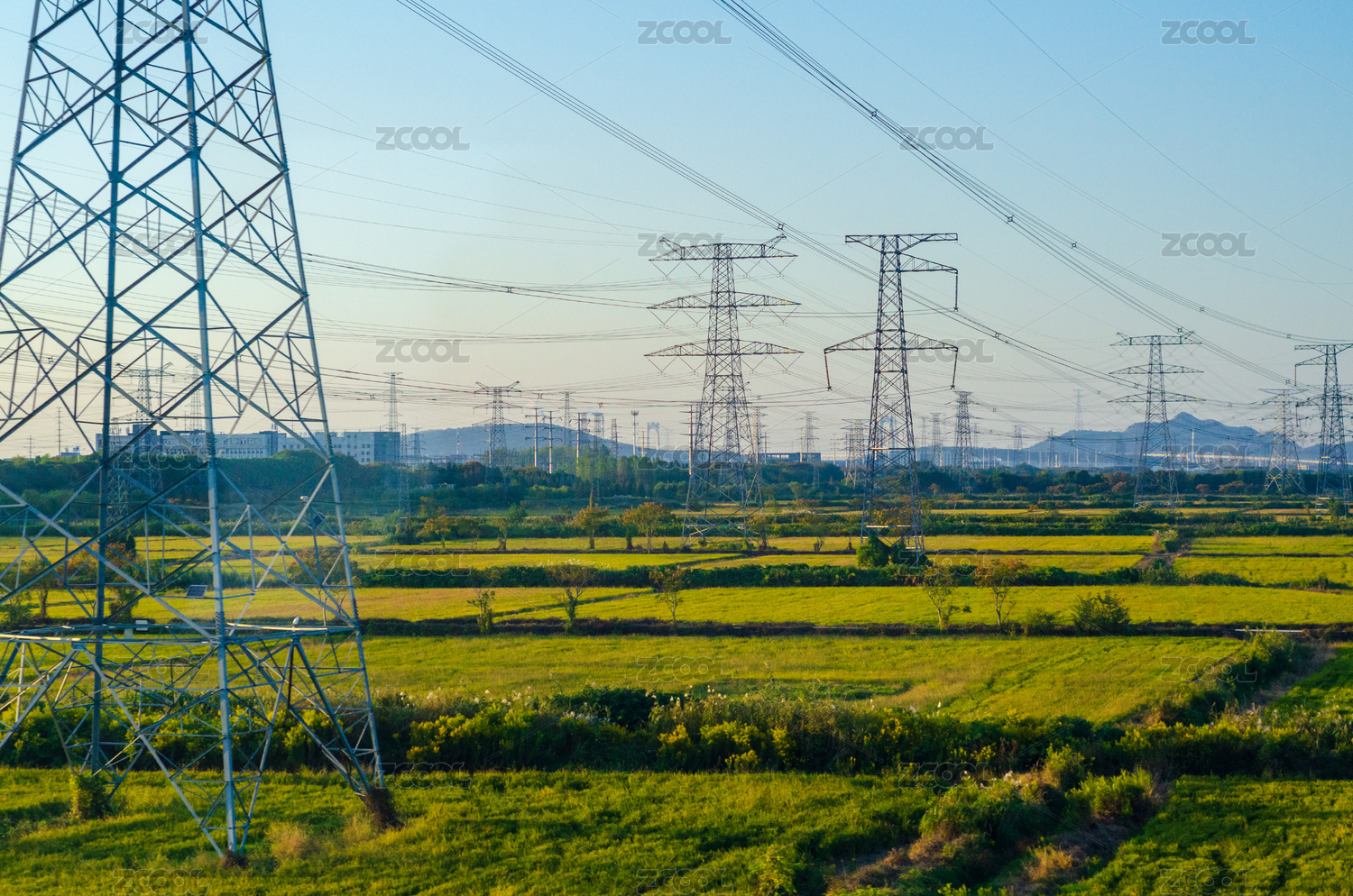 寬廣的田野風(fēng)光上許多高壓電網(wǎng)