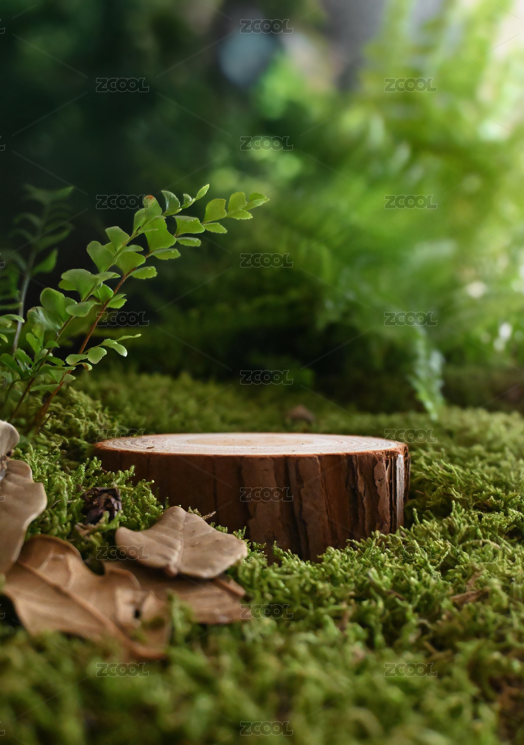樹樁和苔蘚在綠色空間里