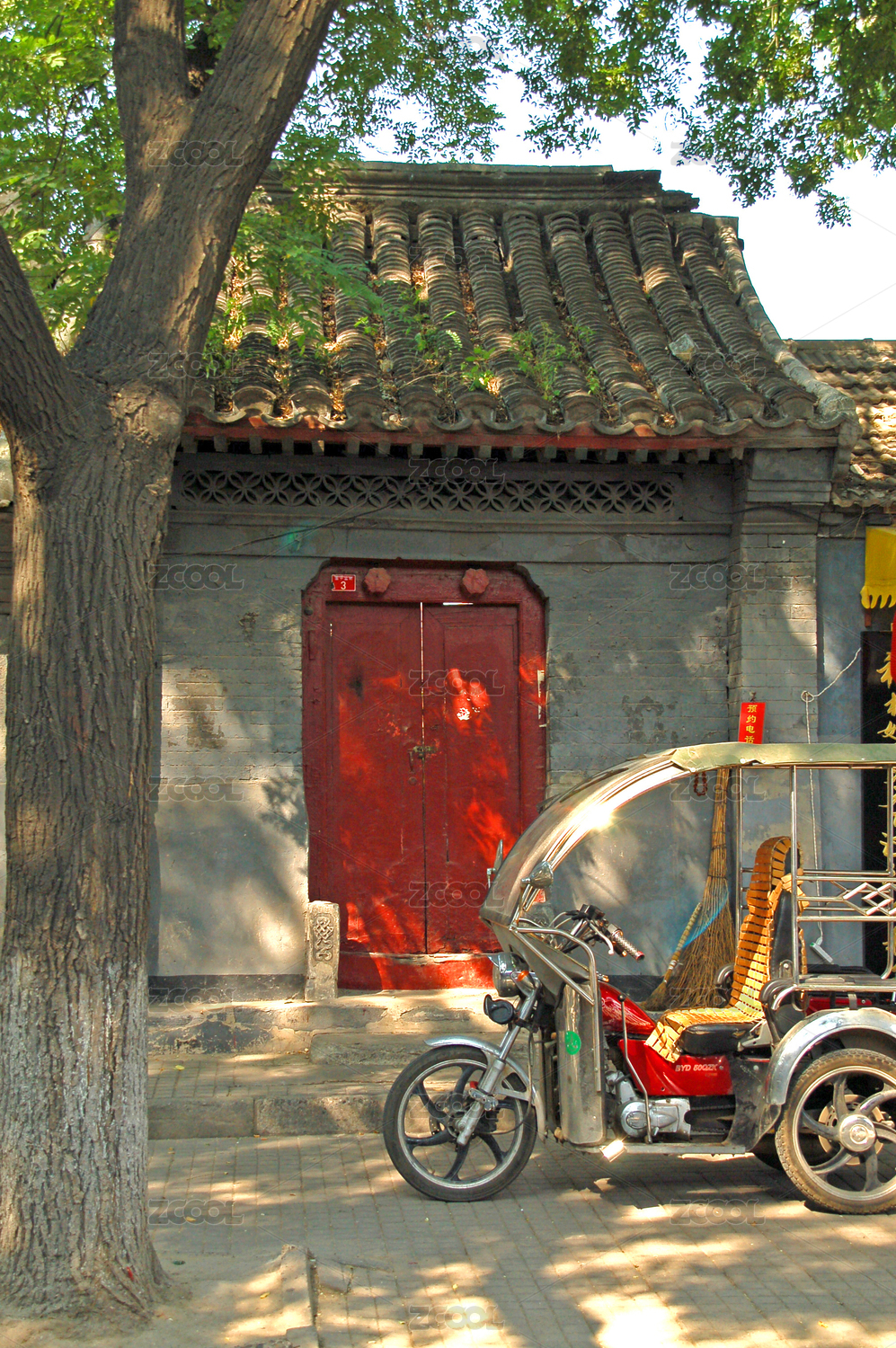 北京市國子監(jiān)胡同民居門樓及停靠的三輪車