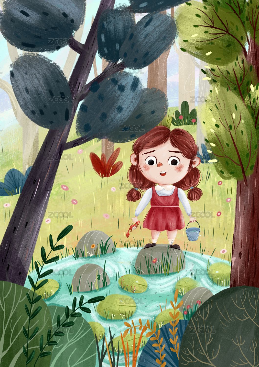 兒童在小河邊捉蝌蚪的插畫