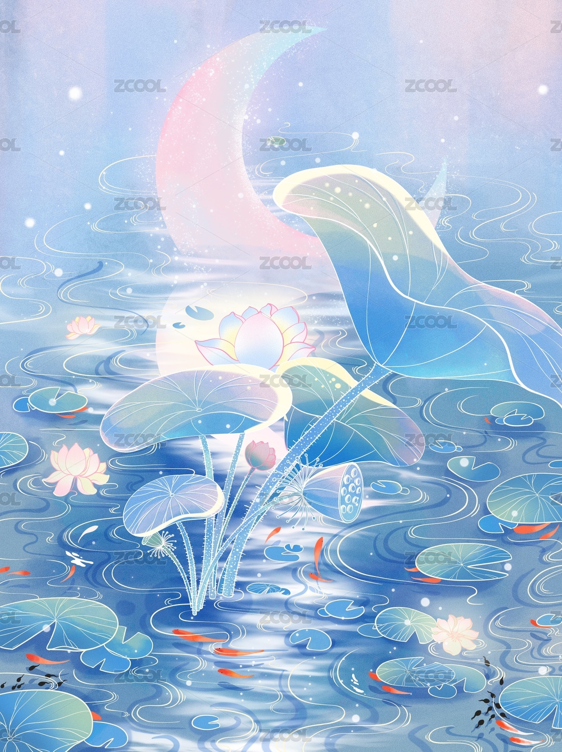 一個(gè)有荷花荷葉月亮錦鯉的池塘