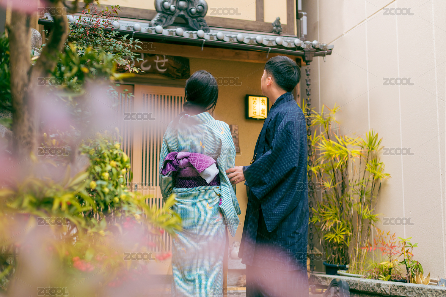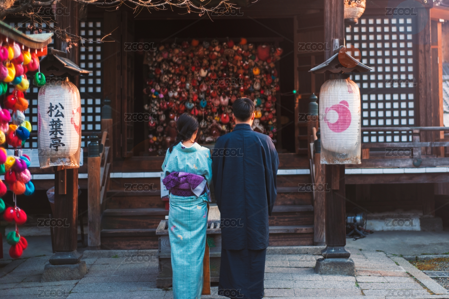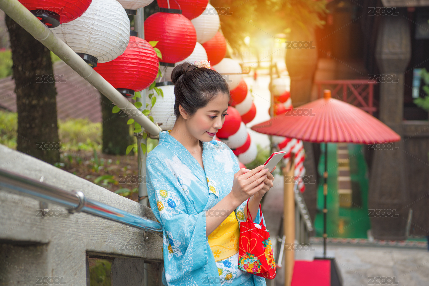美麗的女游客穿著傳統(tǒng)和服參加日本慶祝節(jié)日休息燈籠裝飾面積和使用移動(dòng)智能手機(jī)的短信在暑假搜索指南。