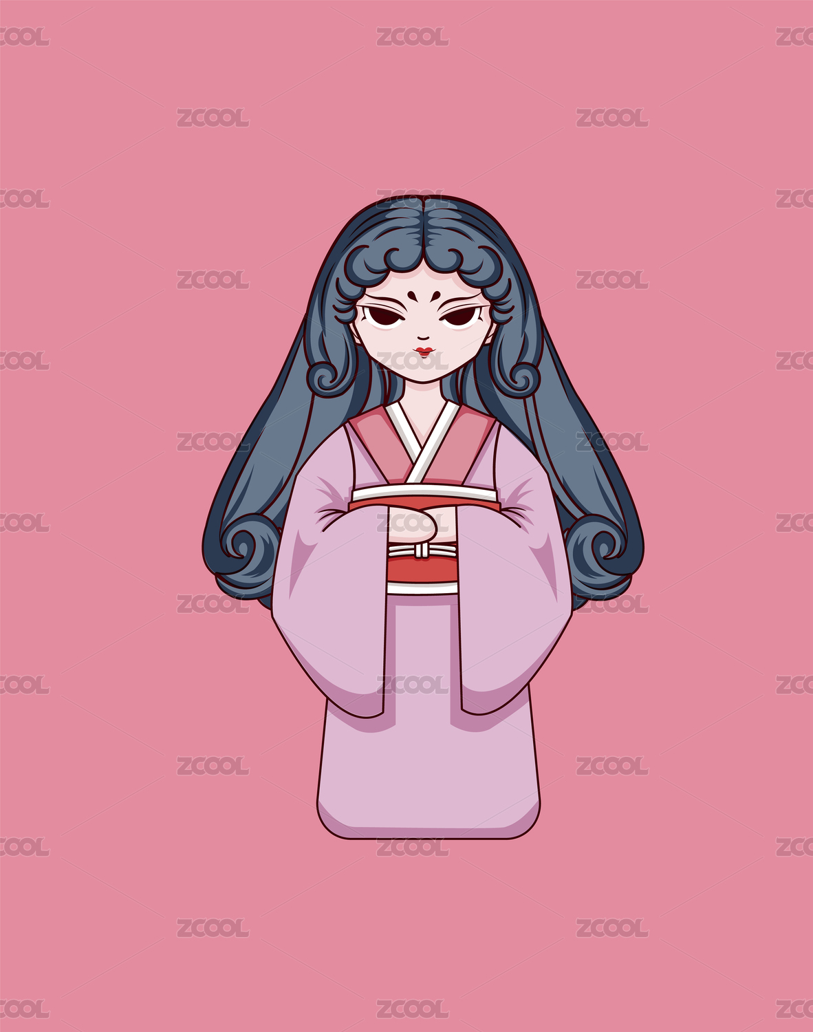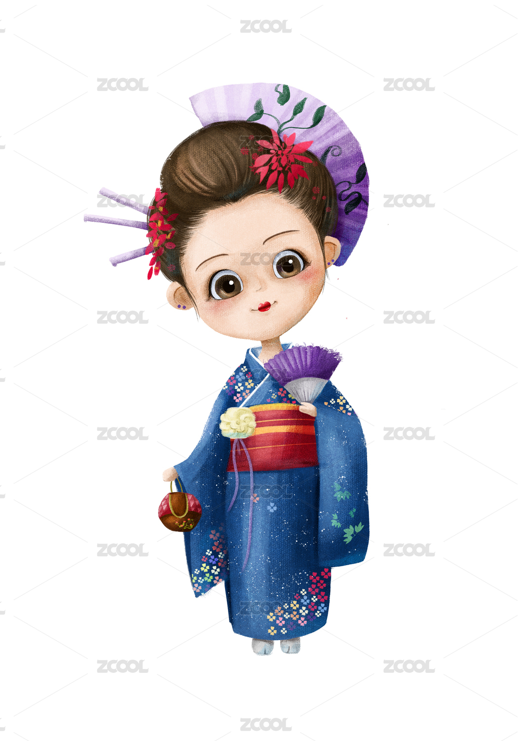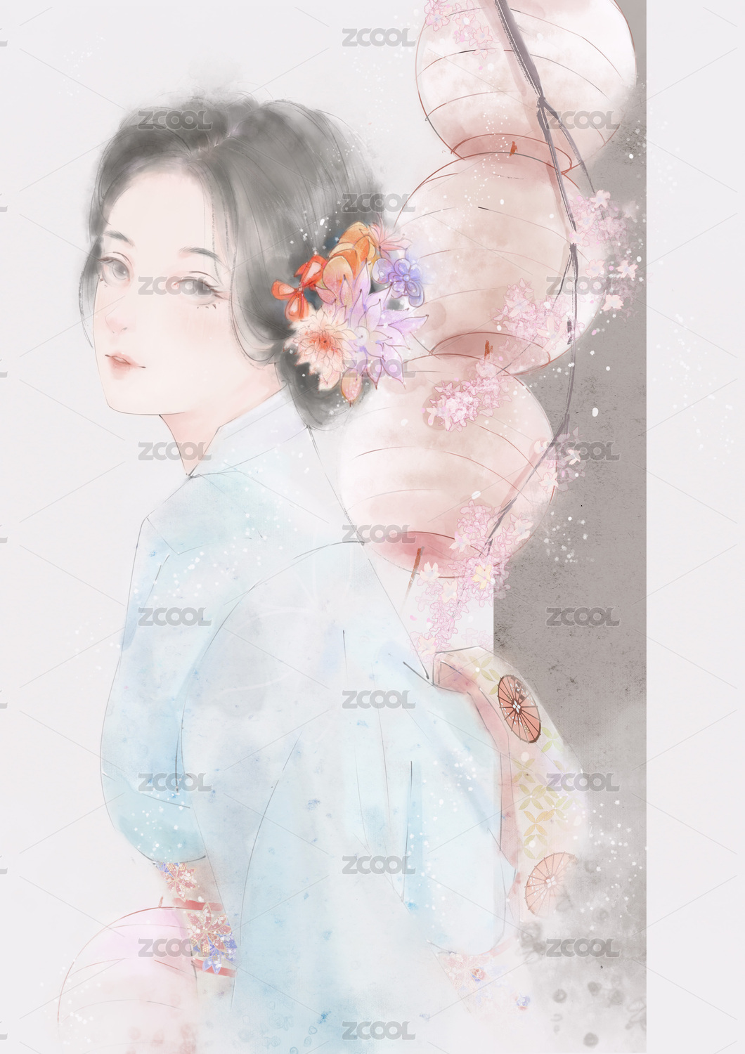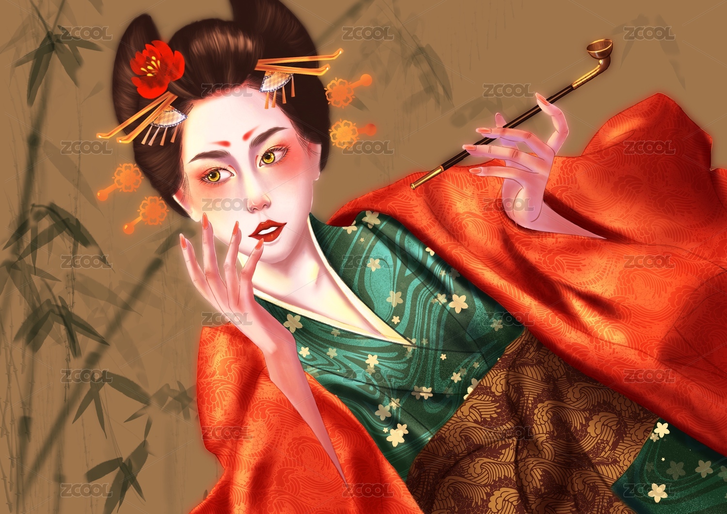 穿著華麗日式和服盛裝的女孩 水彩手繪插畫