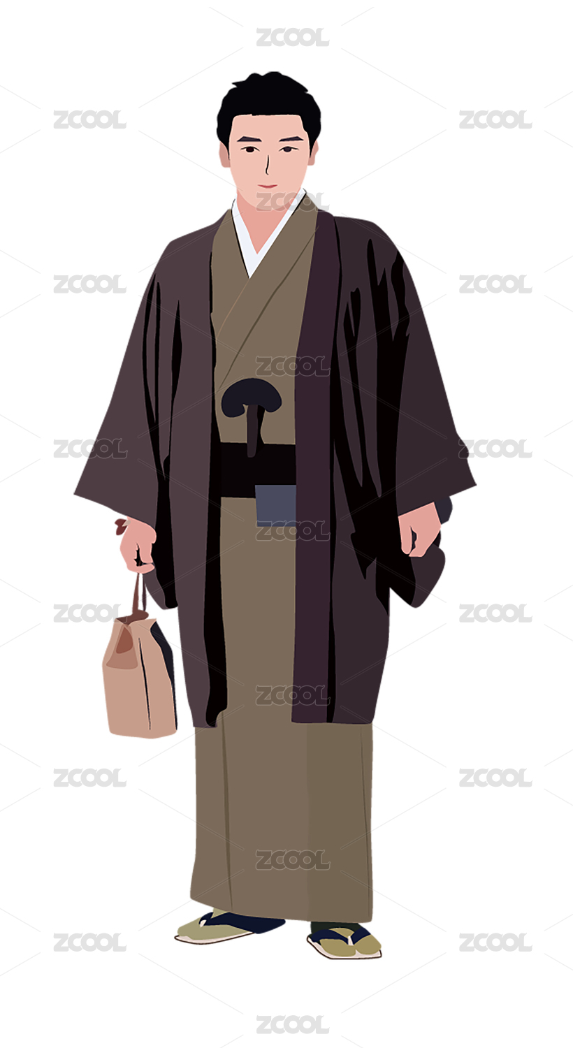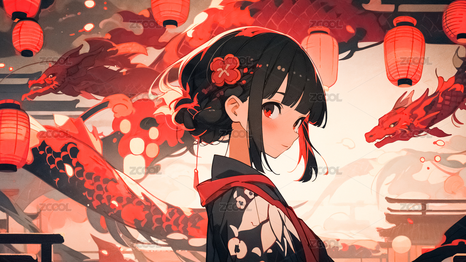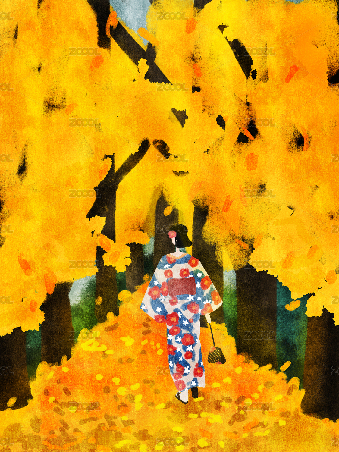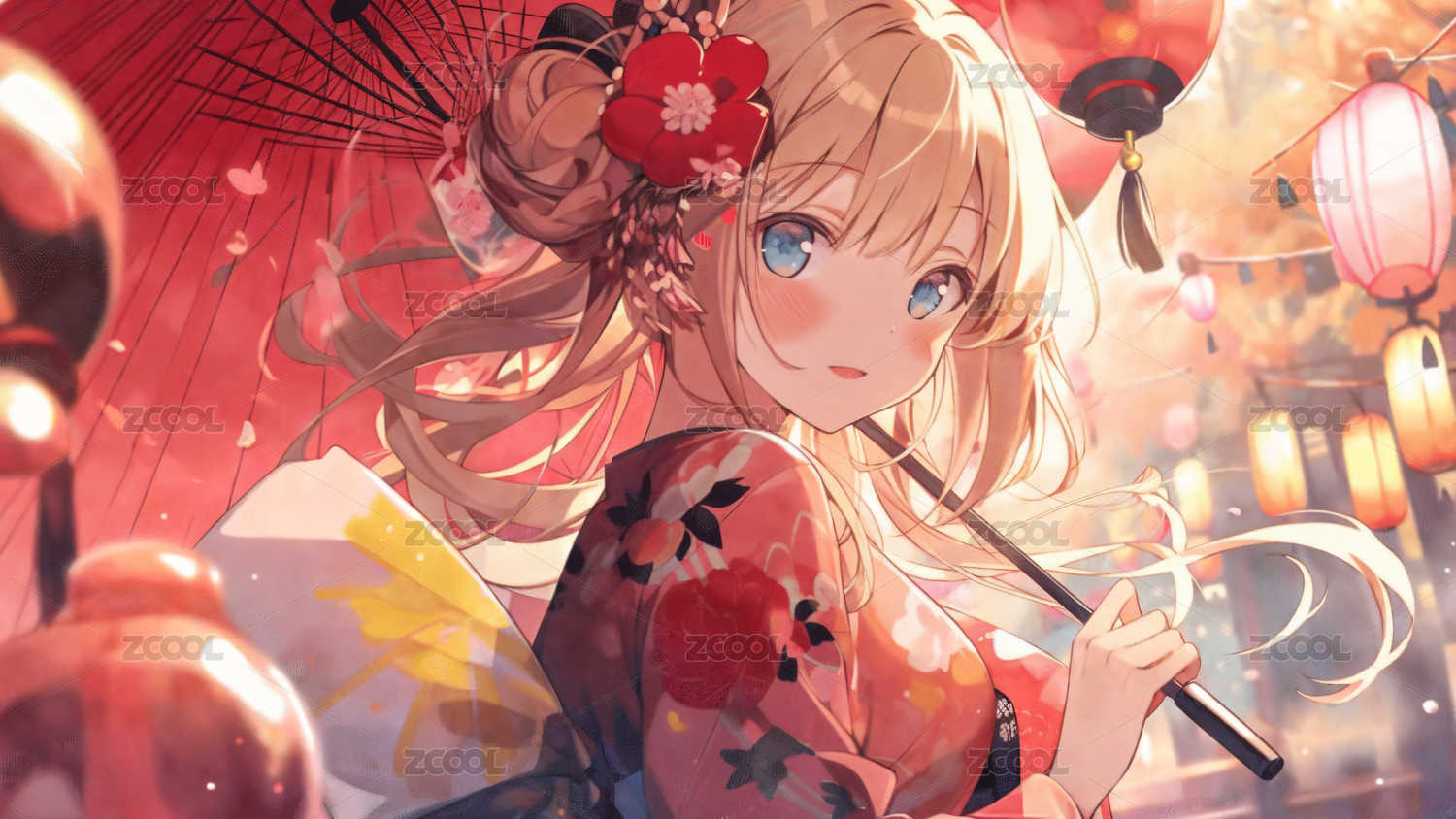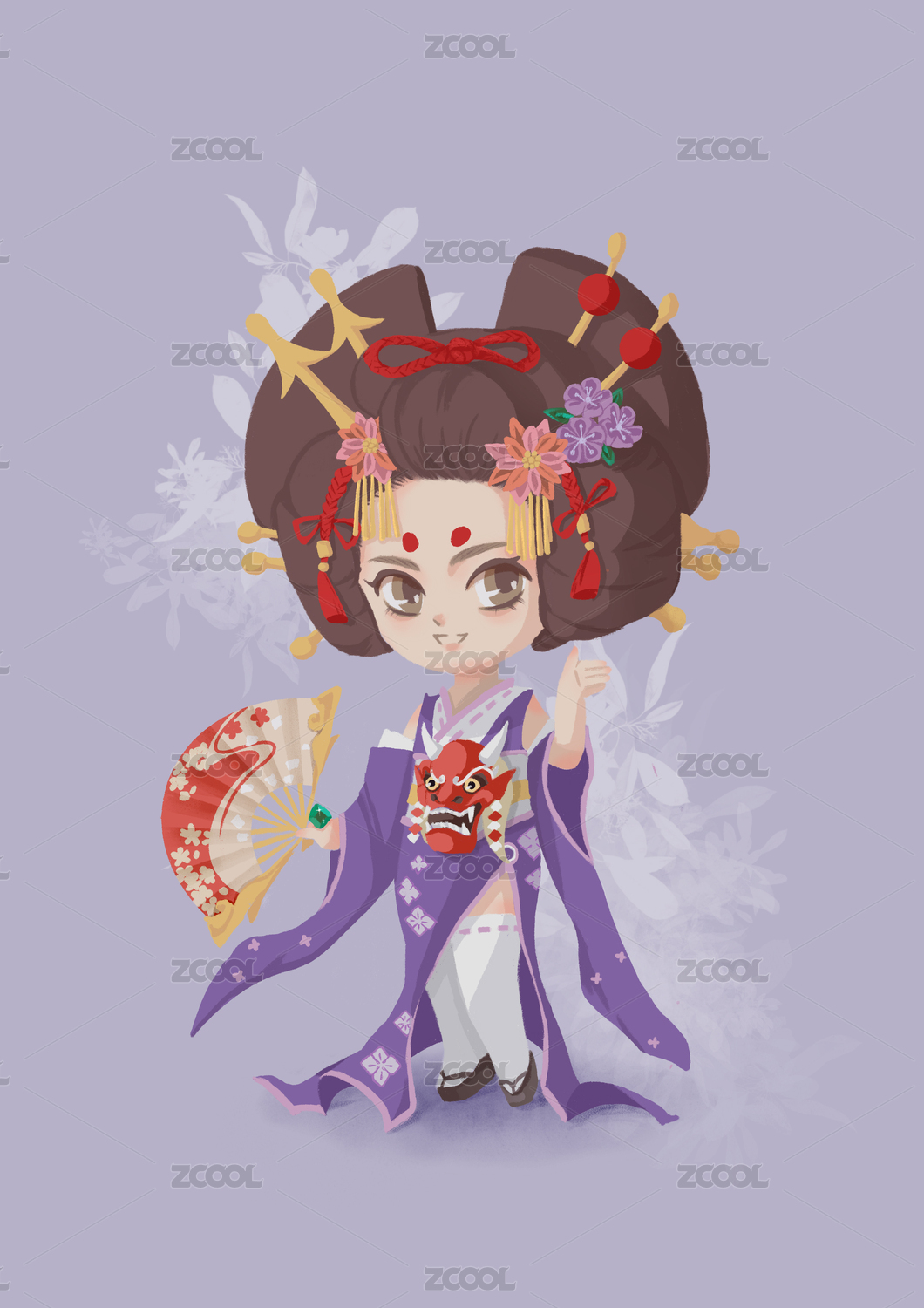 穿著華麗日式和服盛裝的女孩 水彩手繪插畫