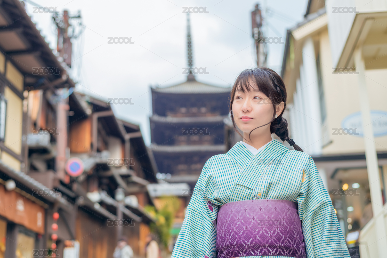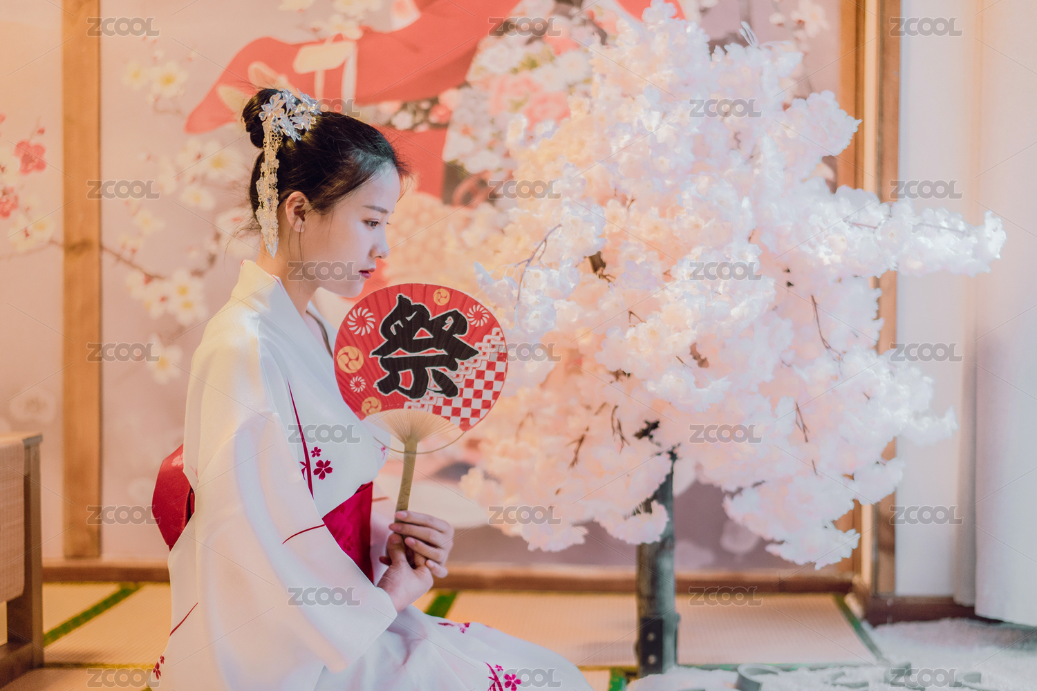 穿和服的日本女人在櫻花開放的季節(jié)來到富士