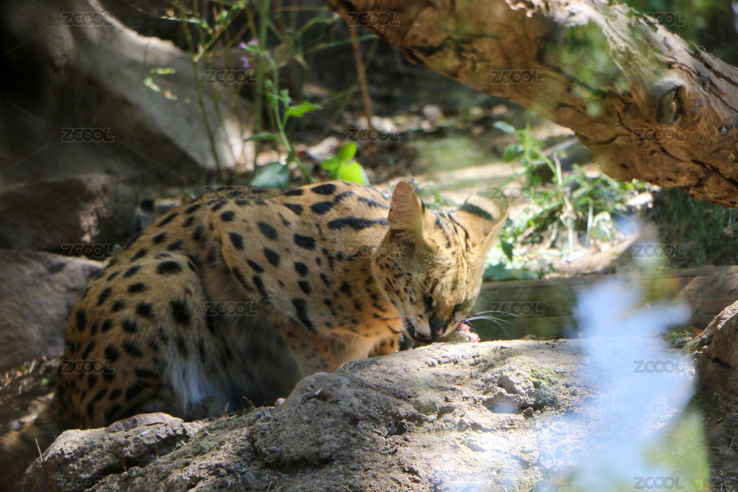 藪貓于巖石樹枝旁的身影