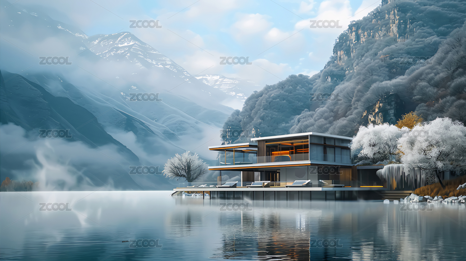 冬天雪景山居酒店民宿風(fēng)景圖片