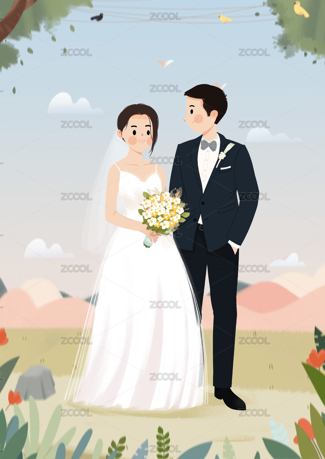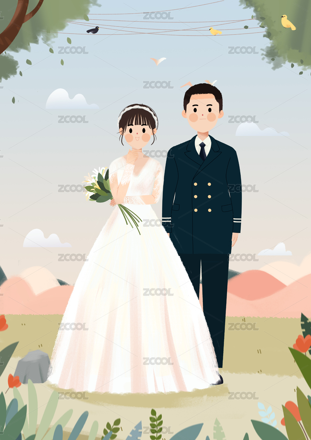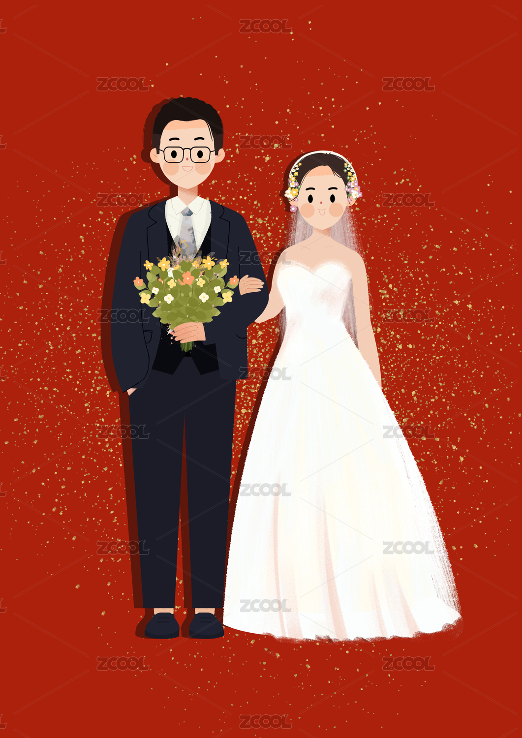 一對卡通新人婚禮插畫