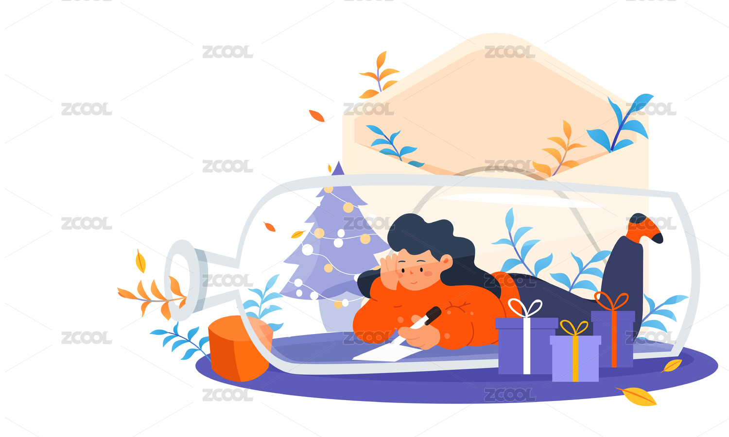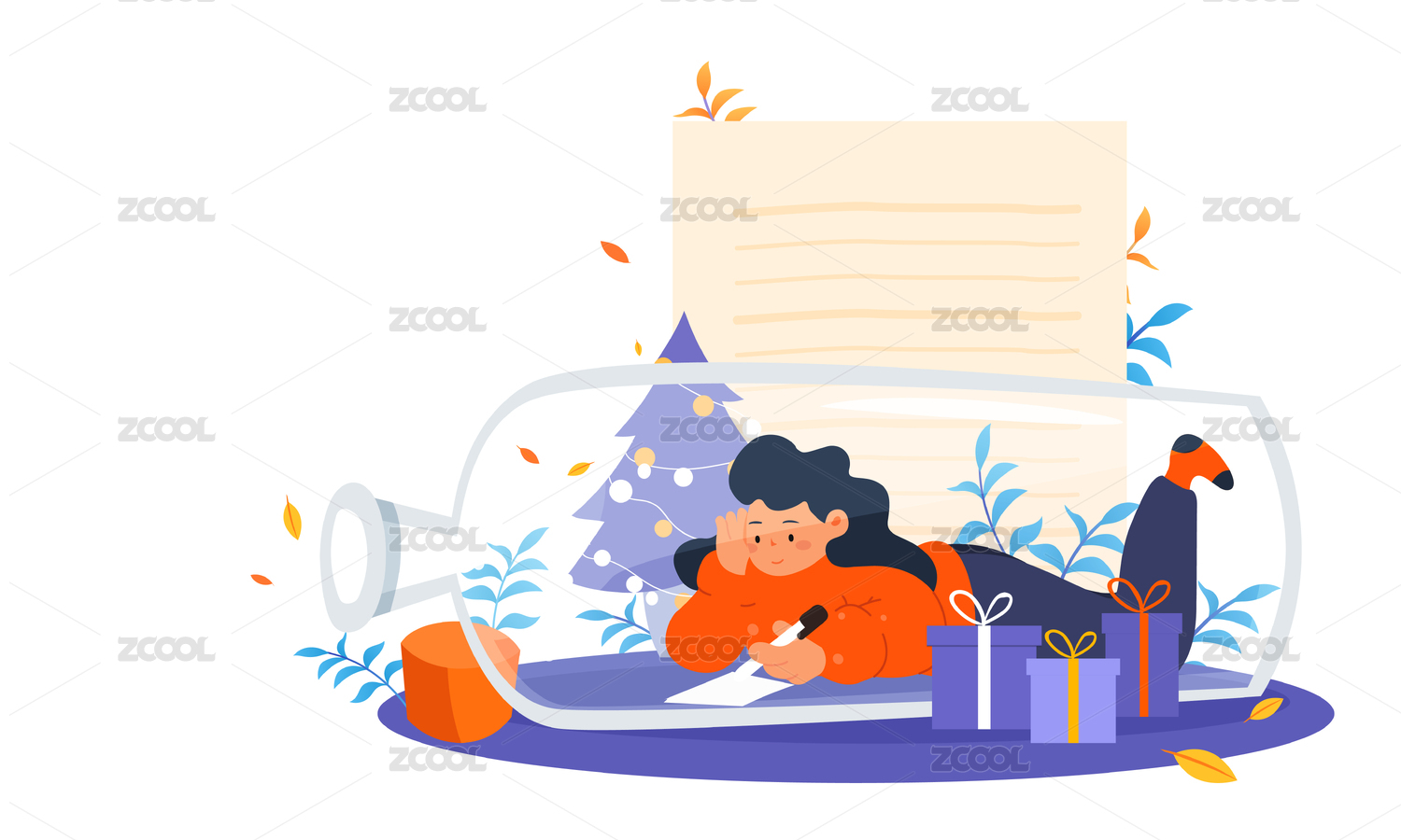 卡通清新人物寫信漂流瓶矢量背景插畫