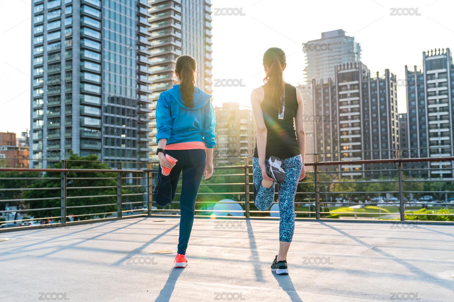 兩個健康的年輕女性后視圖馬尾辮慢跑強(qiáng)身健體與早晨或傍晚的陽光,并在后臺城市觀點(diǎn)之前伸展雙腿。