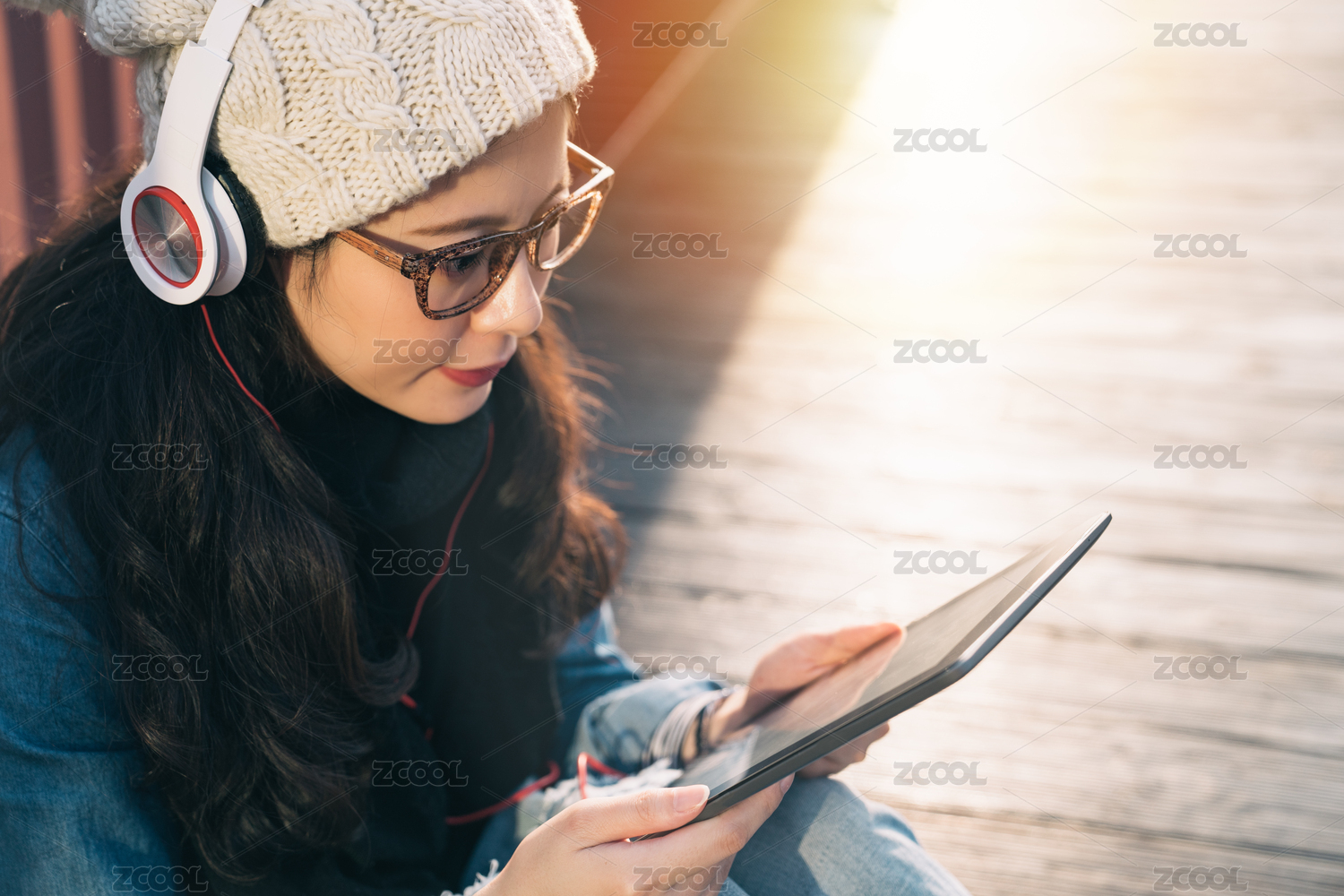 上述觀點(diǎn)年輕漂亮的亞洲學(xué)生與數(shù)字平板電腦坐在橋的木地板網(wǎng)上的信息檢索。
