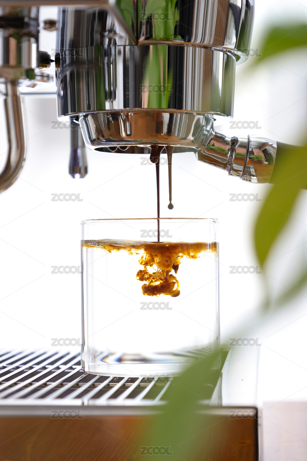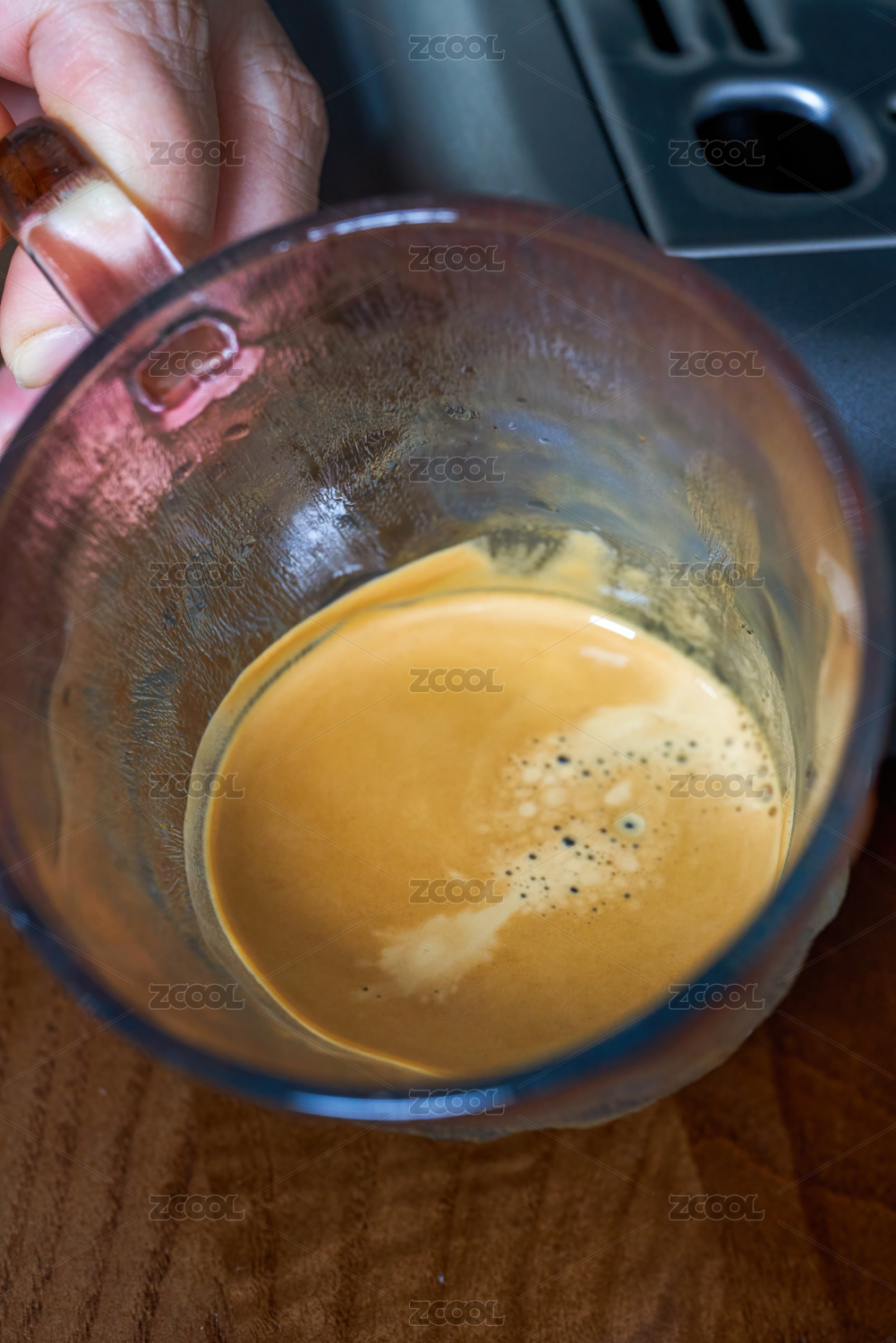 意式濃縮咖啡無(wú)底手柄萃取液體流到透明杯中