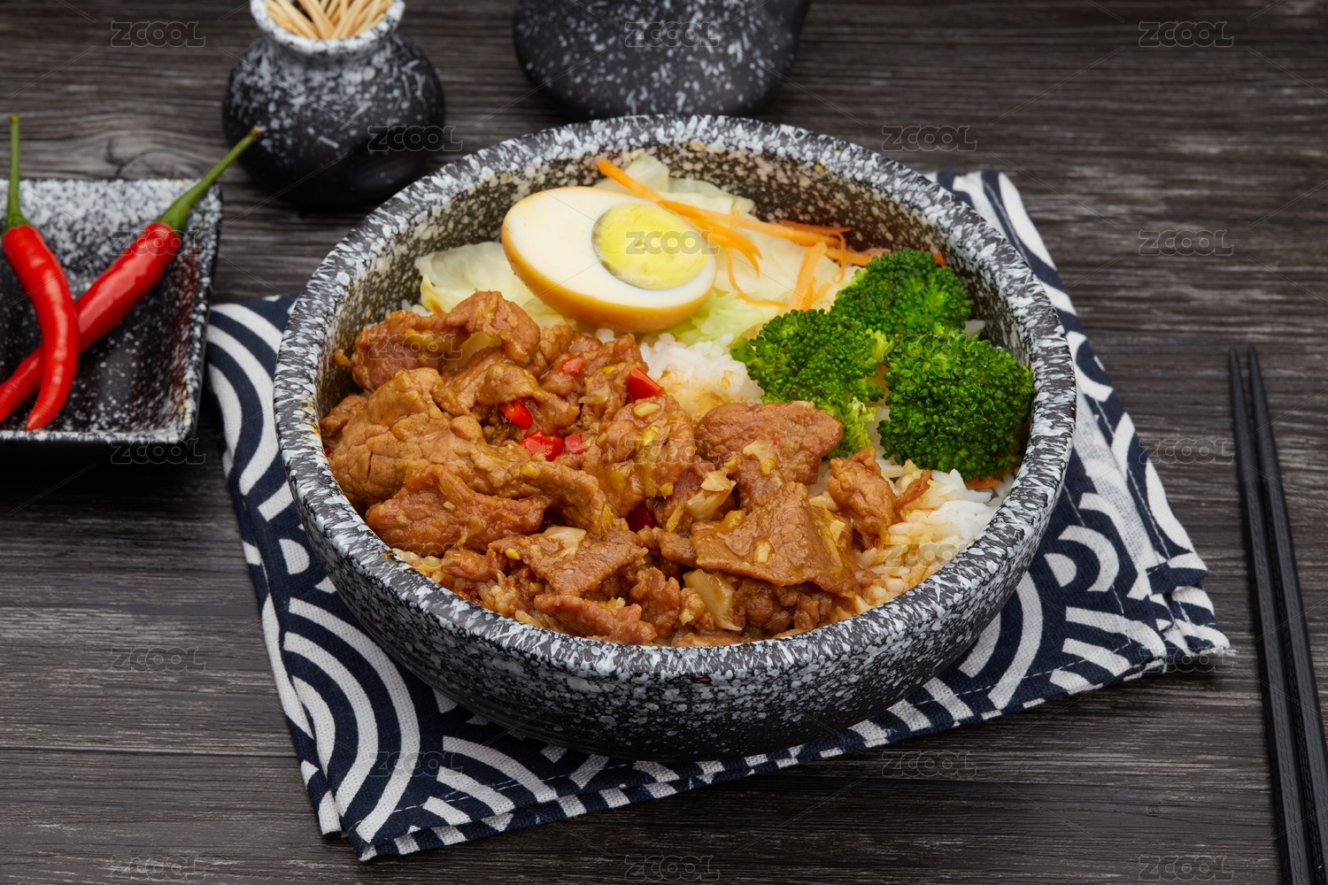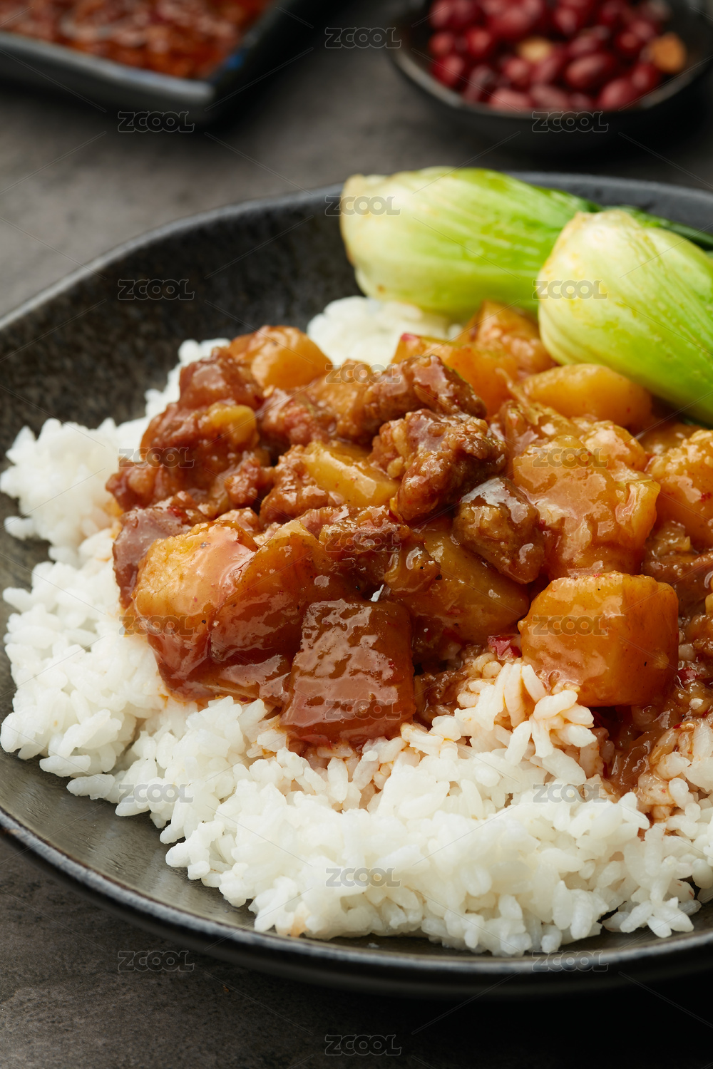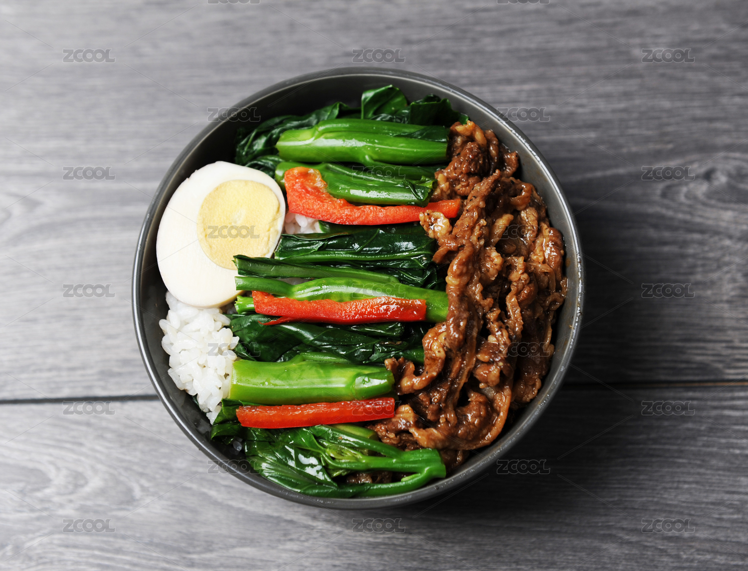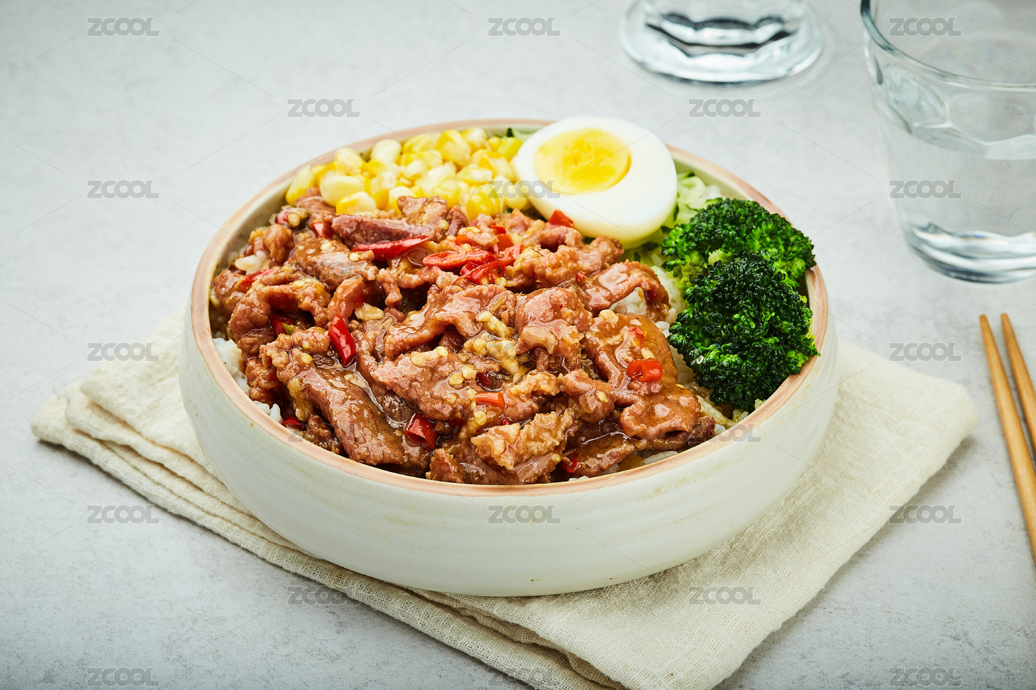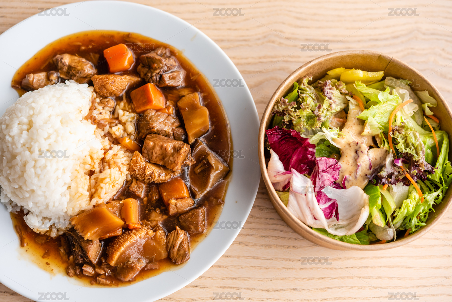一盤紅燒牛肉飯配生菜紫甘藍(lán)沙拉