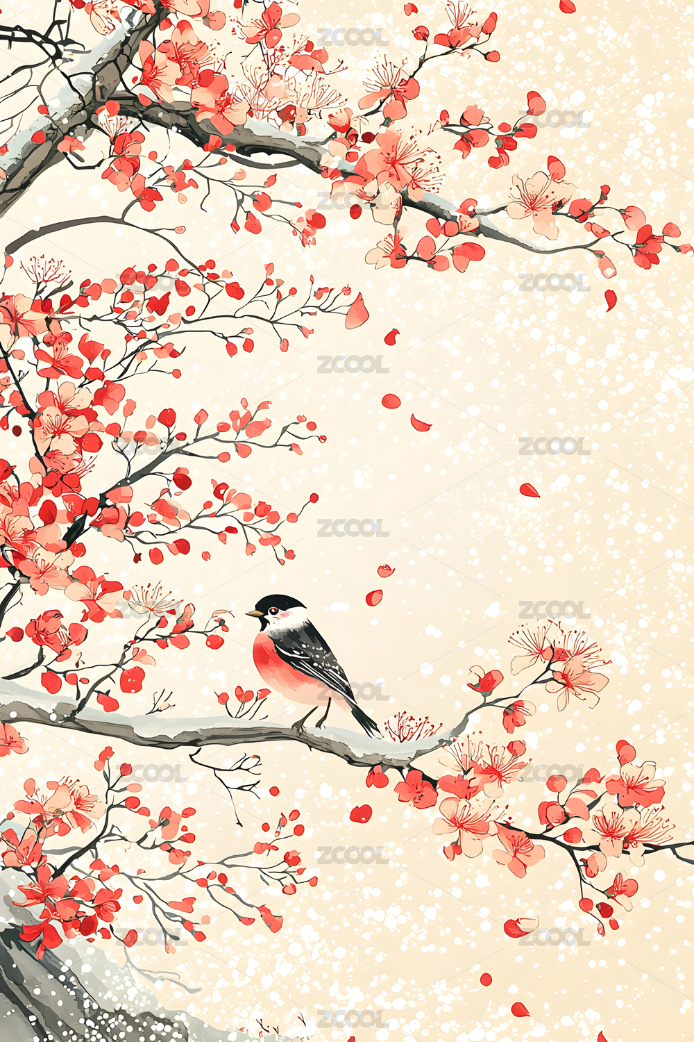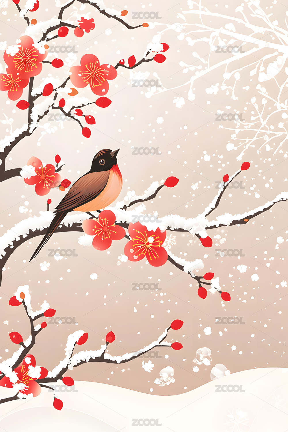 冬日紅梅雪雀插畫