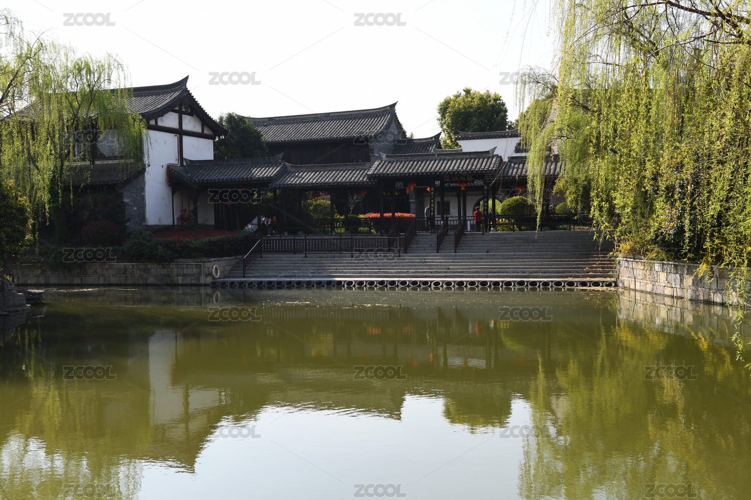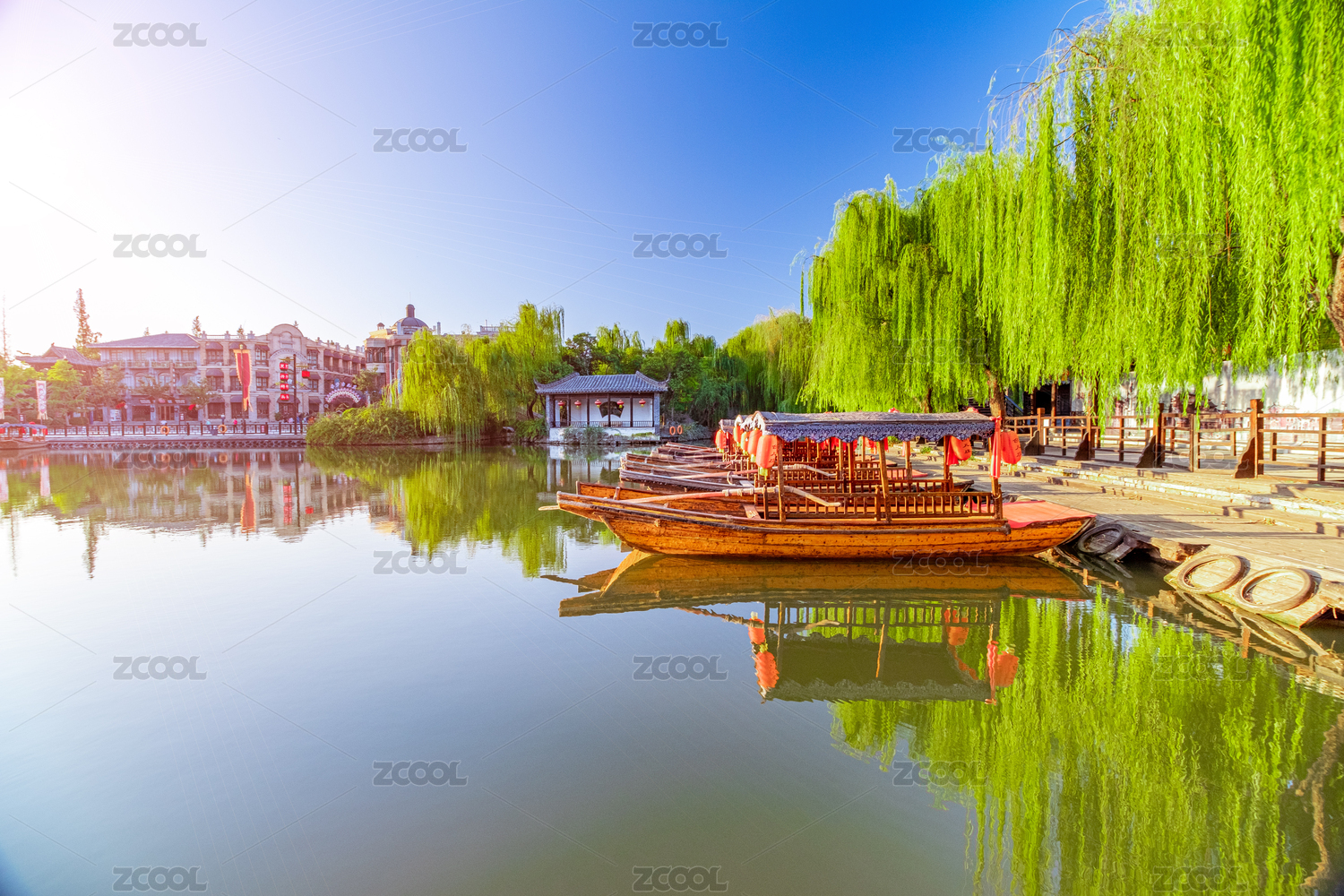 清晨中國(guó)山東省臺(tái)兒莊古城內(nèi)河道兩岸的樹(shù)和古建筑群