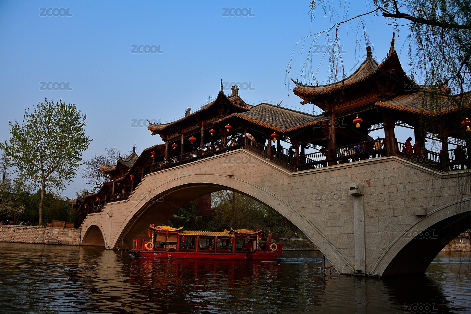 山東省臺(tái)兒莊古城運(yùn)河上的風(fēng)雨廊橋