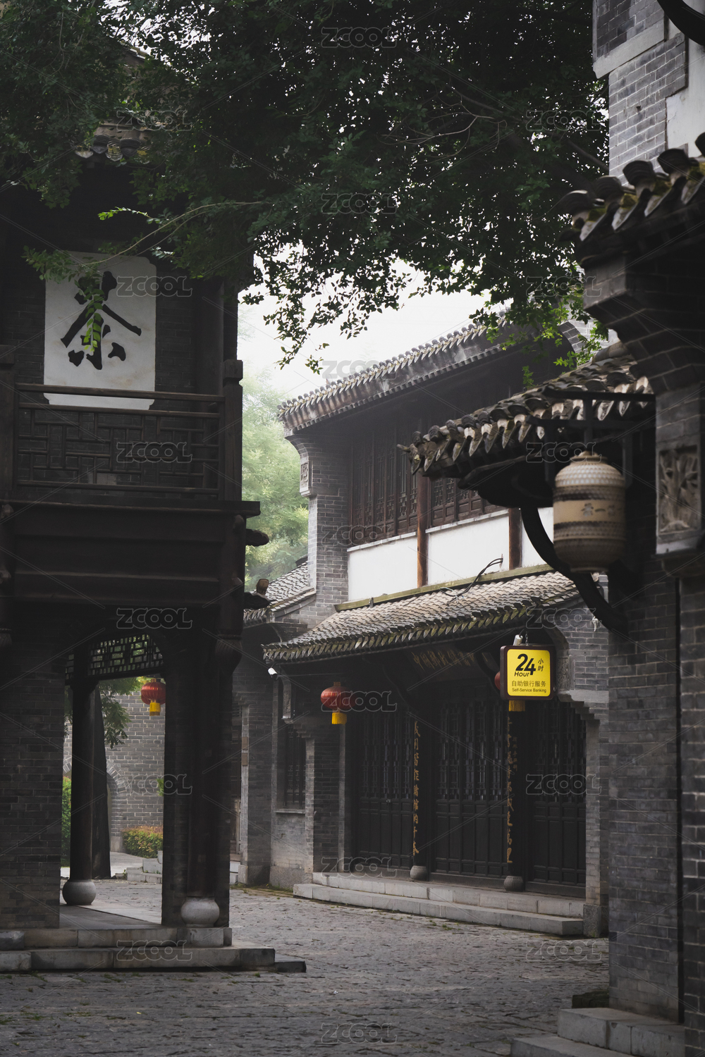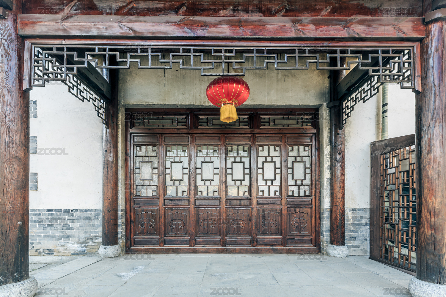 山東省臺(tái)兒莊古城內(nèi)掛紅燈籠的實(shí)木中式門(mén)窗