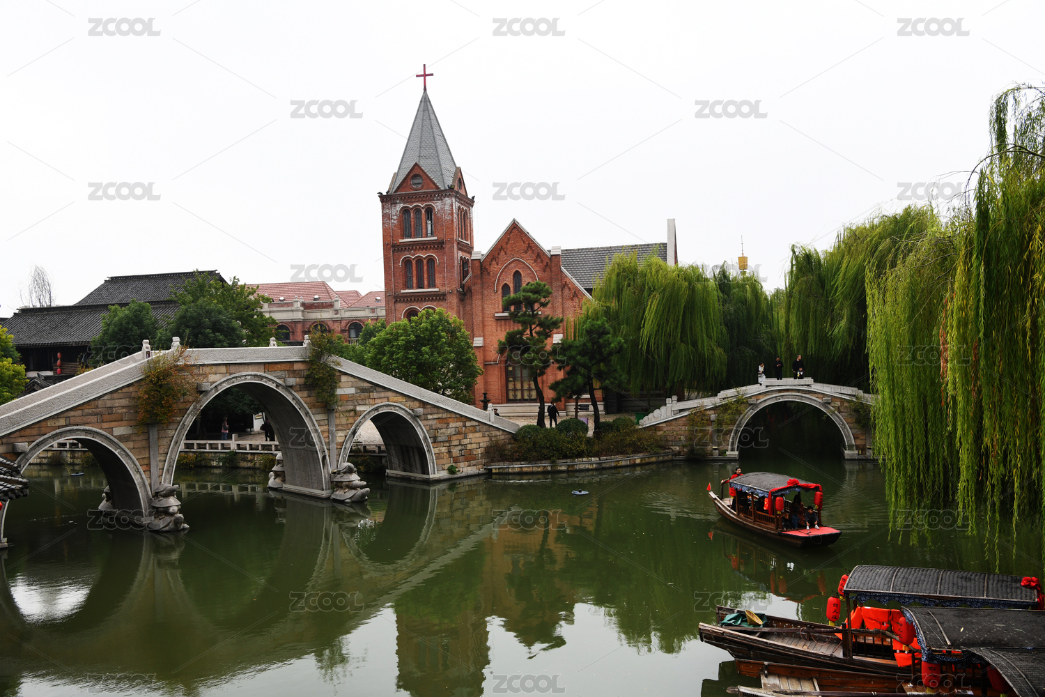 中國(guó)山東臺(tái)兒莊古城的橋與船