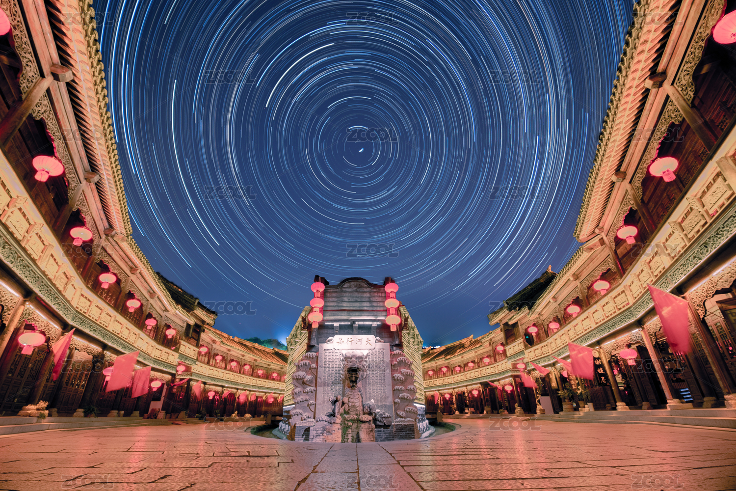 中國(guó)山東省臺(tái)兒莊古城內(nèi)船型街為地景的星軌圖
