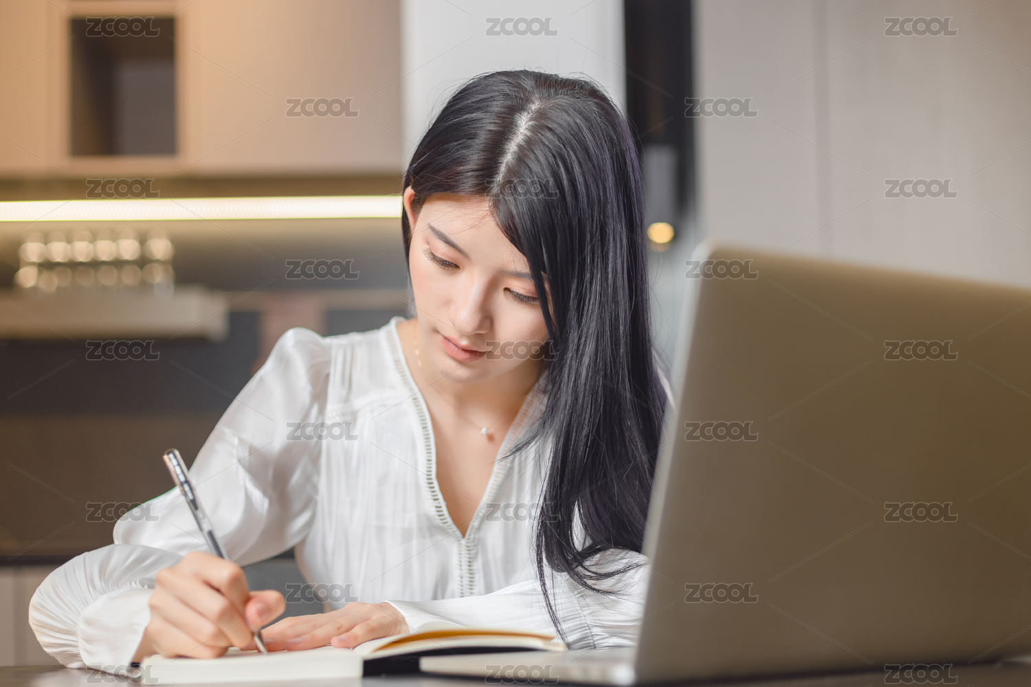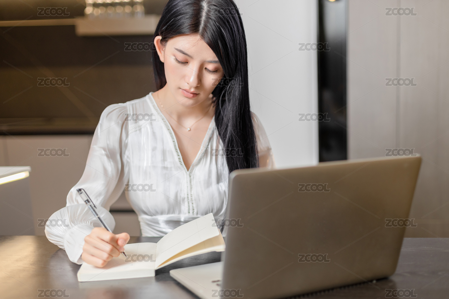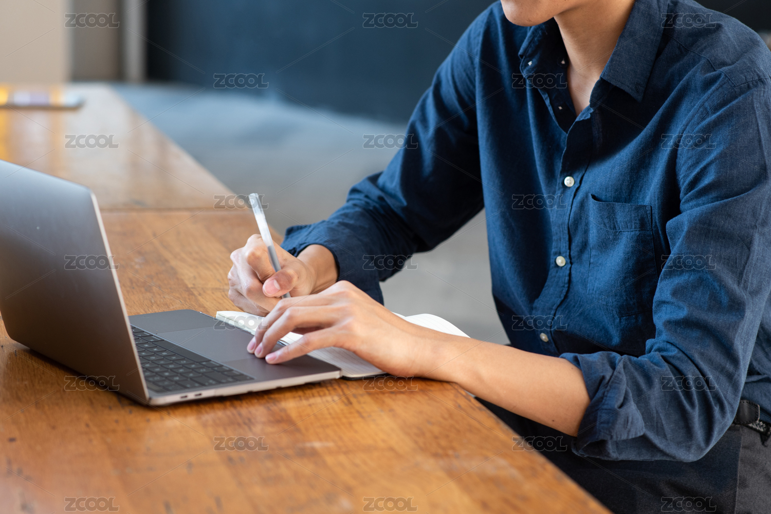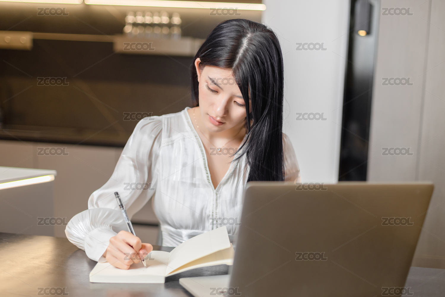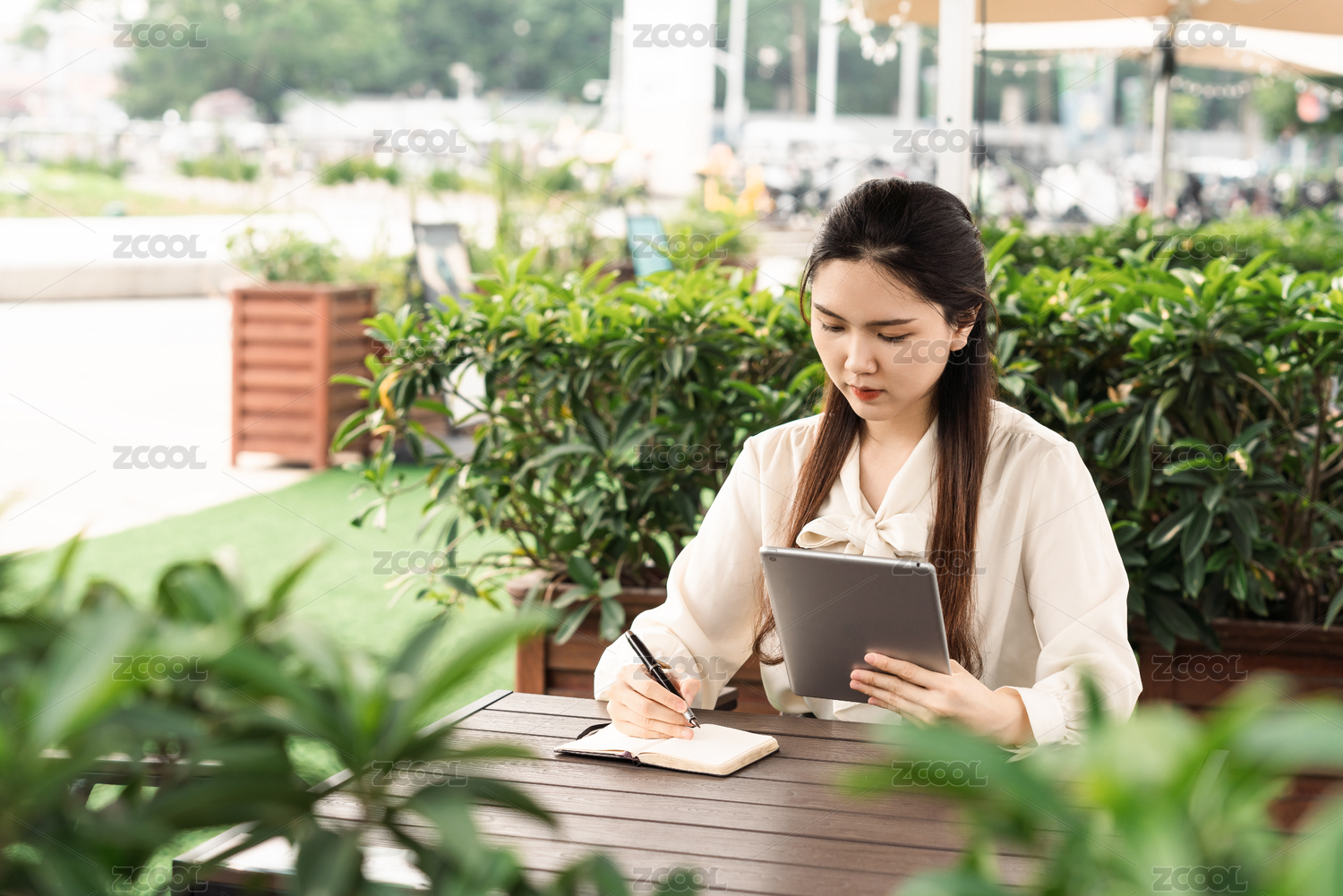 亞洲商務人士一邊看平板電腦一邊記筆記