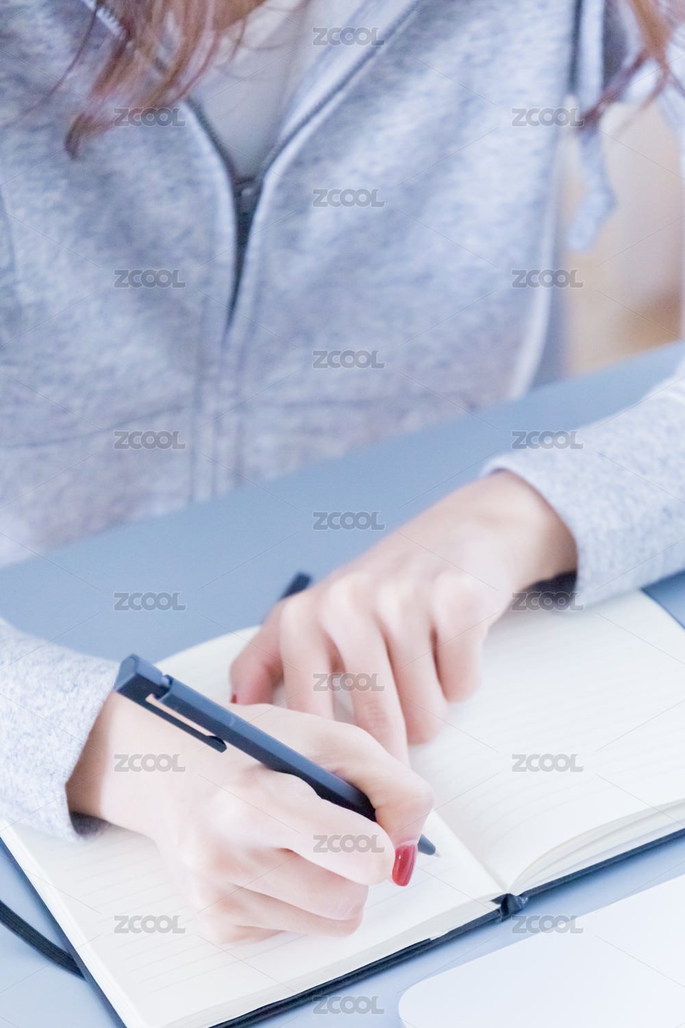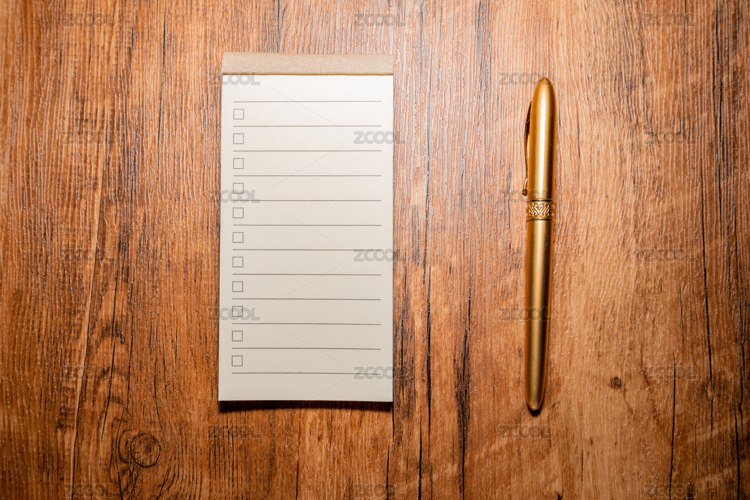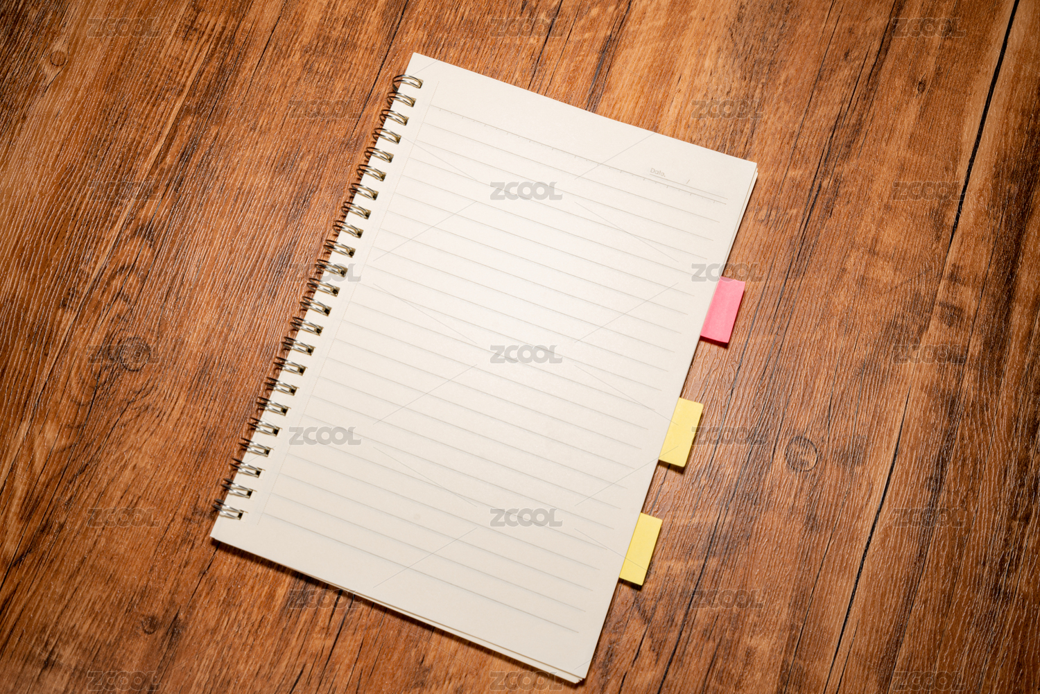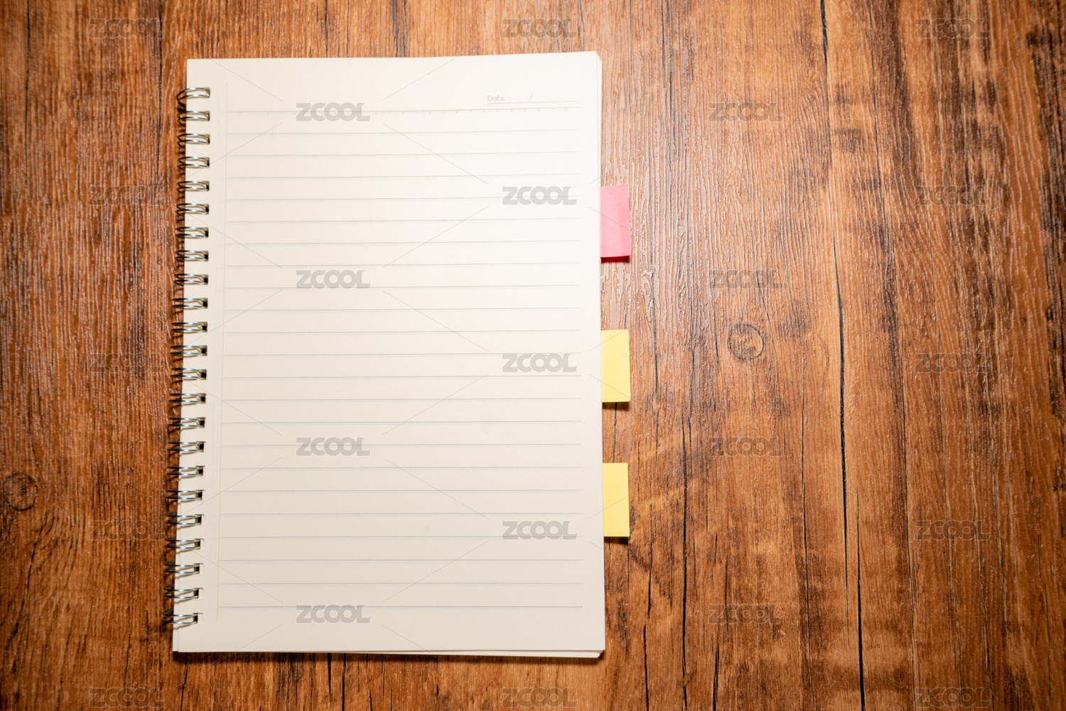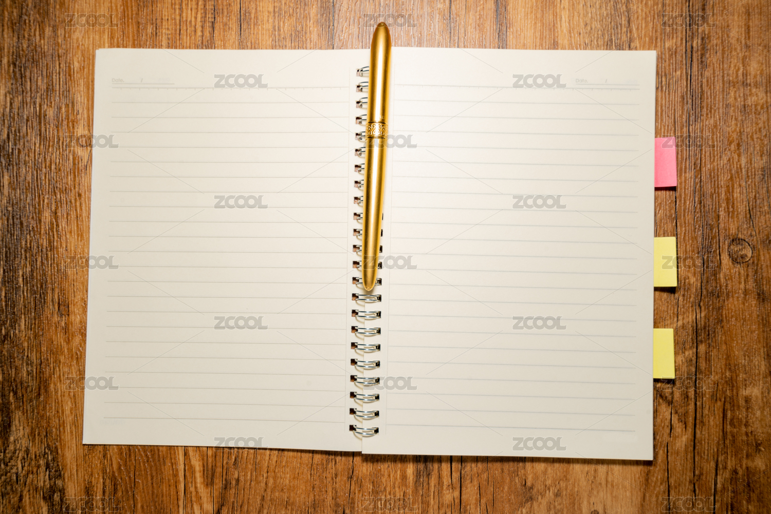 空白的有書簽的筆記本放在辦公室木制紋理辦公桌上搭配金色鋼筆學習記筆記概念