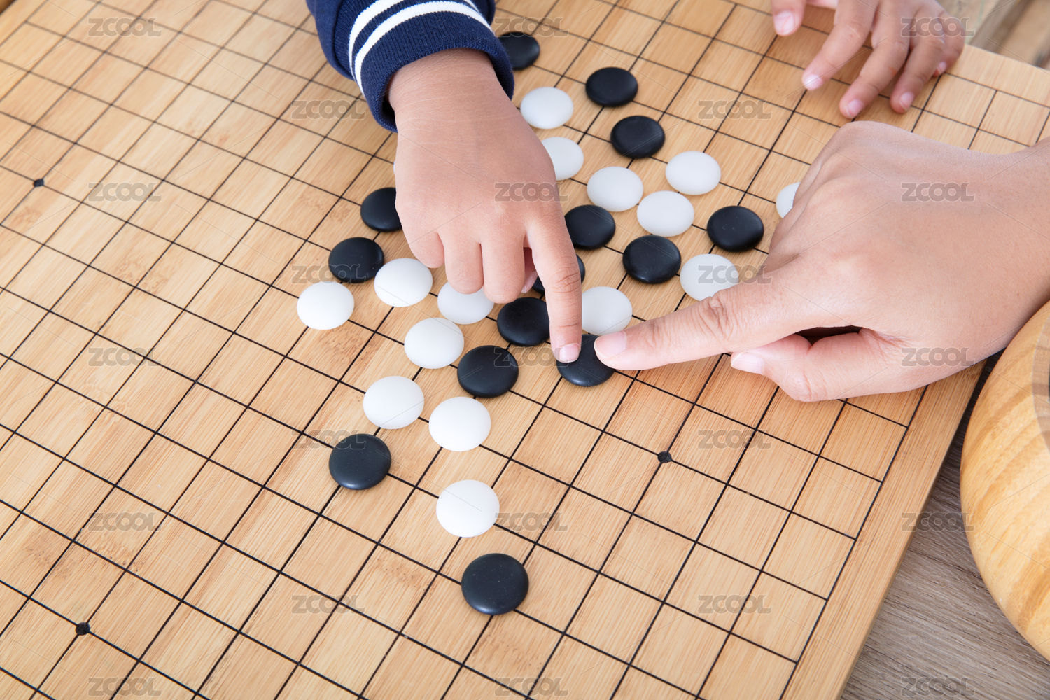 中國(guó)圍棋棋盤上一只大人的手指導(dǎo)著小孩的手下圍棋