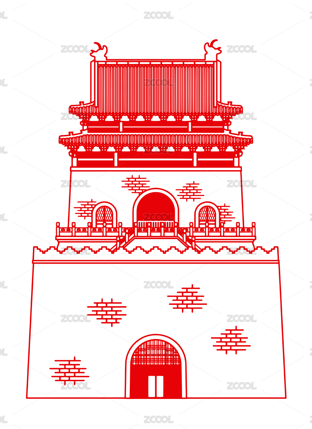 剪紙風(fēng)格北京中軸線古建筑鐘樓插畫