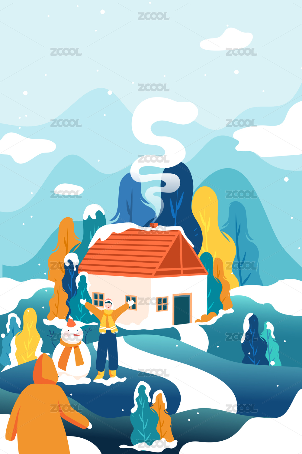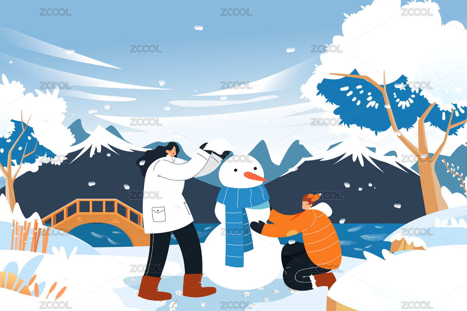 卡通冬季堆雪人朋友玩耍風(fēng)景背景矢量插畫