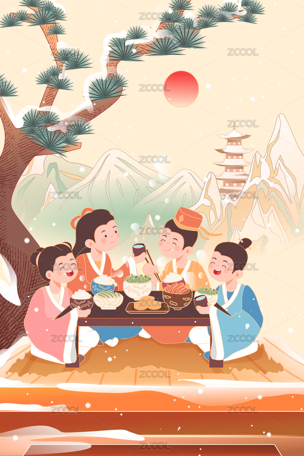 冬季古人團(tuán)圓吃飯中國風(fēng)矢量插畫