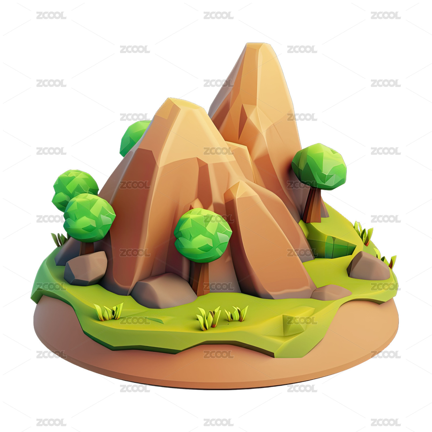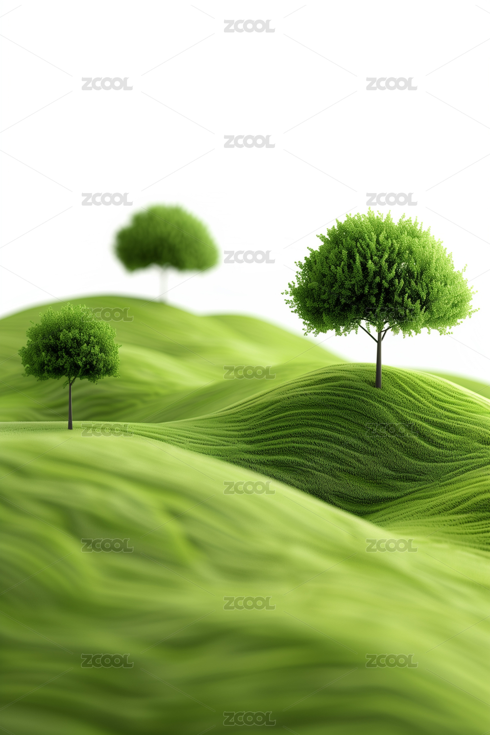 夏天有樹和草的綠色山丘3D立體卡通插畫