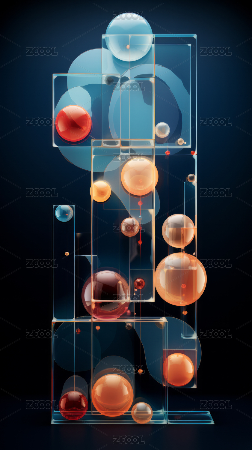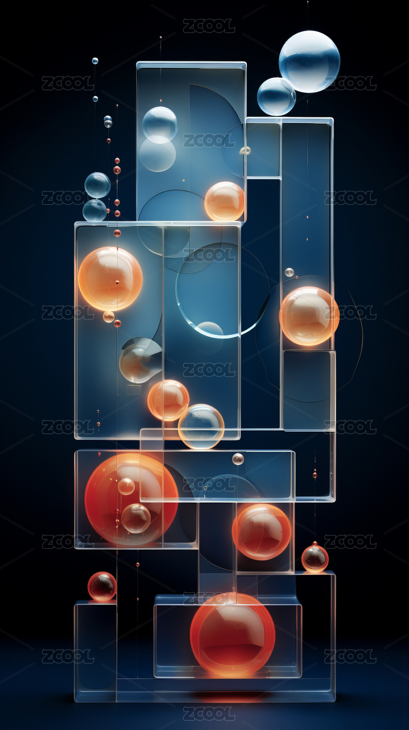 透明矩形與浮動(dòng)球體的抽象圖像