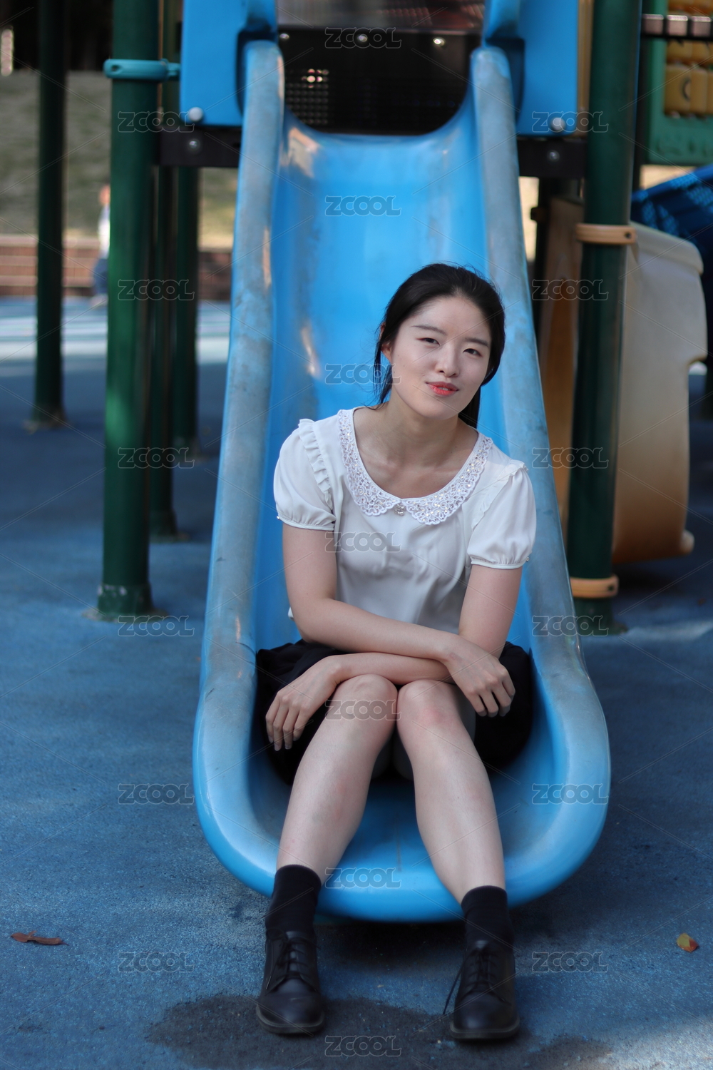 在兒童樂園中玩滑滑梯的年輕女孩