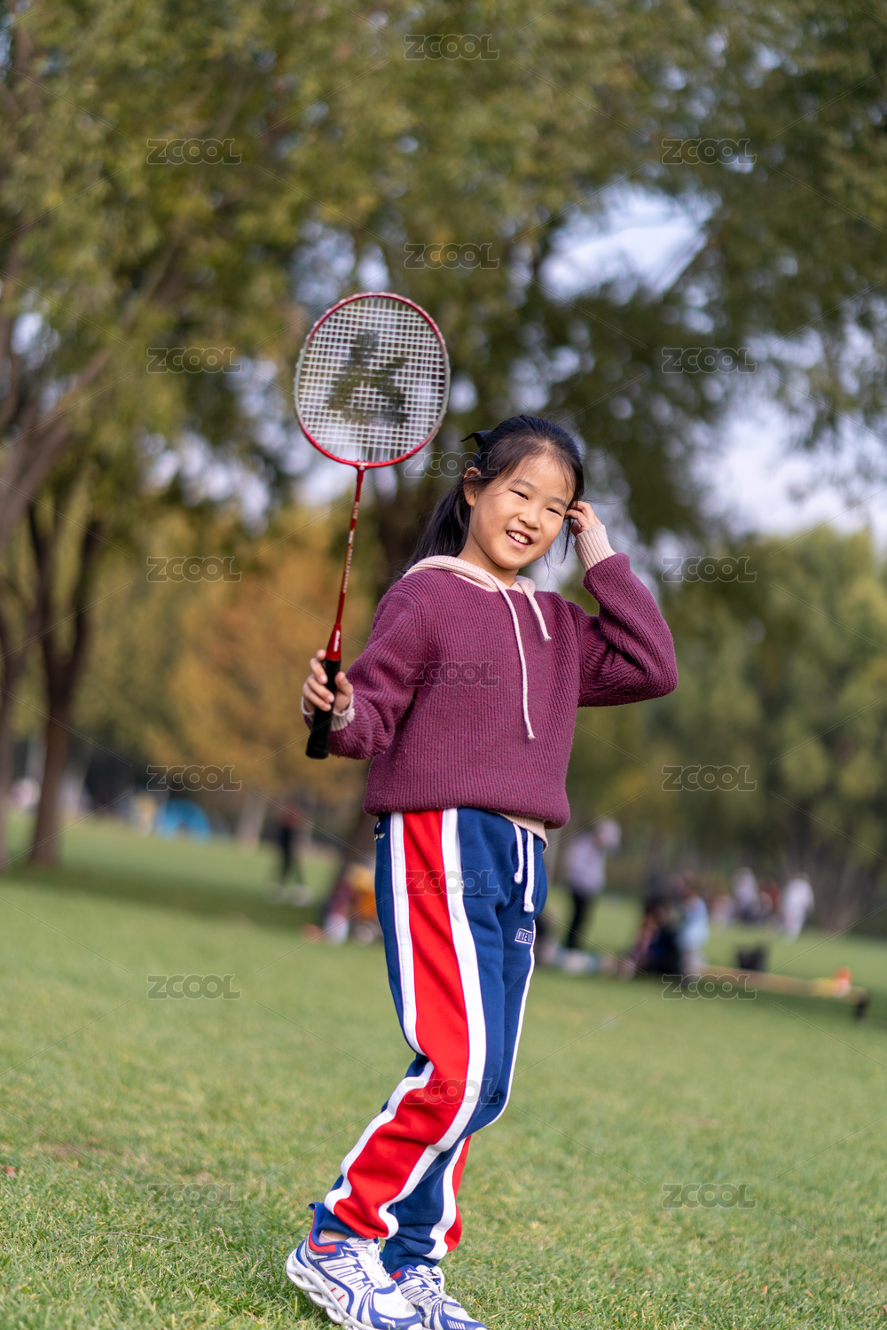 草地上打羽毛球的亞洲女孩