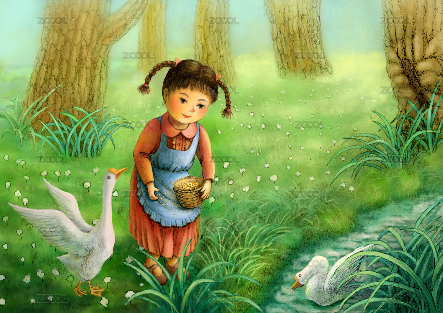 午后喂鵝的小女孩插畫