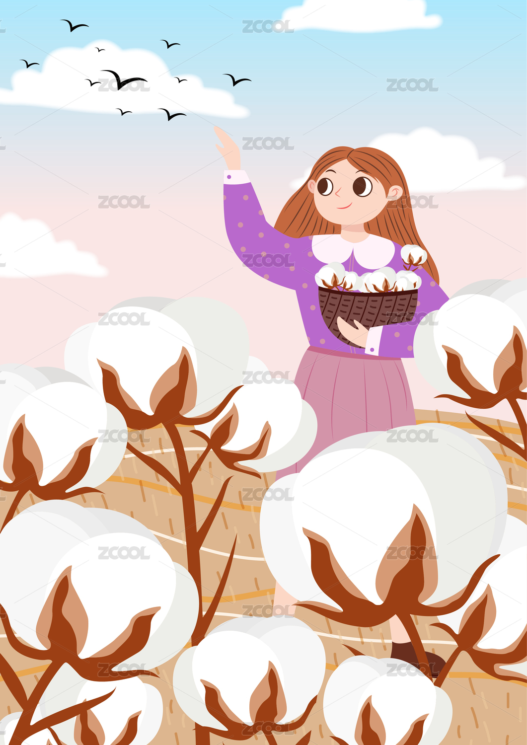 女孩抱著籃子摘棉花藍(lán)天白云田野秋季插畫