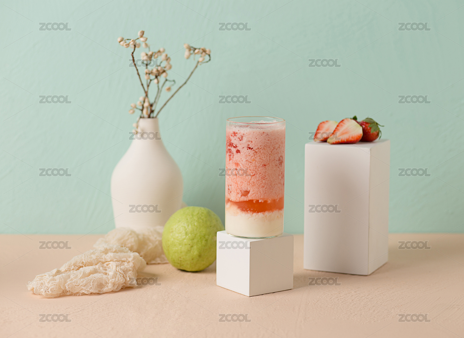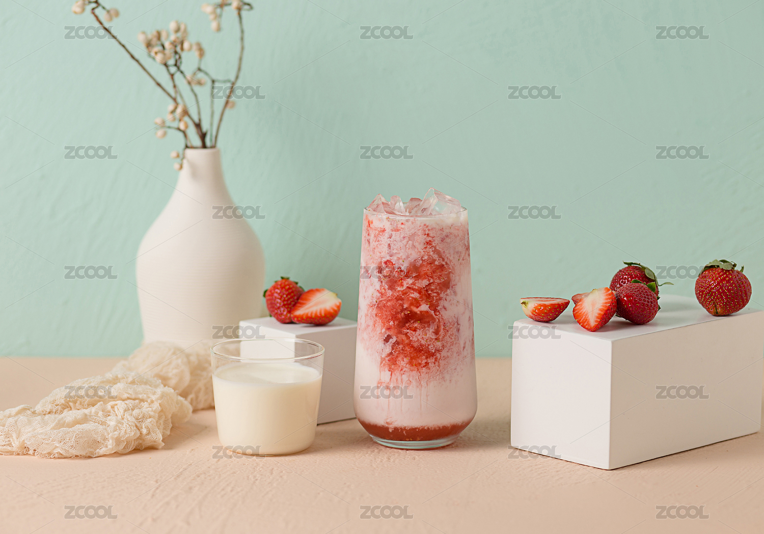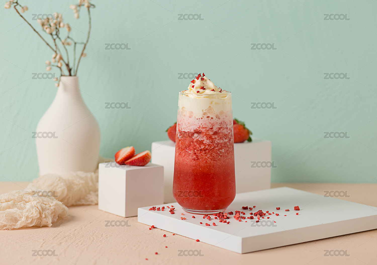 黑色背景下的鮮榨冰凍茶飲料,鮮榨草莓奶茶